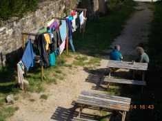 15h00 Une fois installé, ma première tâche important fut toujours la lessive. Le but étant de repartir le lendemain avec du linge de rechange sec, je profitais donc du soleil et des courants d’air dès que possible. On croise sur le chemin bon nombre de marcheurs avec la lessive qui sèche avec des épingles à nourrice sur le sac à dos toute la journée. J’ai horreur de çà même si j’ai du m’y contraindre une ou deux fois. En théorie le pèlerin doit avoir trois tenues : sa tenue du jour, un tenue de rechange et une tenue sale. Tout ceci étant en fait très variable. L’essentiel étant surtout d’être au sec . Les Albergues proposent souvent des machines à laver (4€) et des sèche-linge (4€) . On peut toujours partager la lessive avec d’autres pèlerins.
