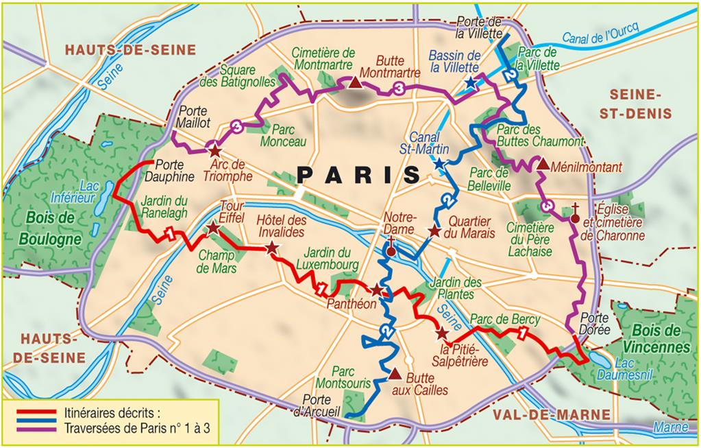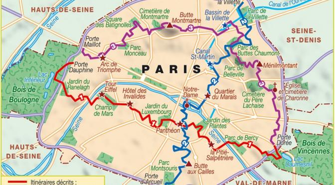 Je croyais connaître Paris et je me suis trompé ! Un jour de temps gris et froid je renonçais à partir seul randonner dans les bois. Je procédais à un repli stratégique sur Paris avec en tête de faire une longue marche reliant le Bois de Boulogne, à l‘Ouest de la Capitale au Bois de Vincennes au sud-Est. On imagine facilement la multitude chemins reliant ces deux espaces verts parisiens. Mais un peu par hasard, je suis tombé sur une documentation touristique de la Mairie de Paris. Il existe en fait deux tracés PR (Petite Randonnée) parfaitement balisés . Le TP1 est montré sur cette image, le TP2 vous propose une traversée du Nord au Sud, entre La Cité des Sciences et de l’Industrie jusqu’à la Cité Universitaire , Porte de Gentilly.