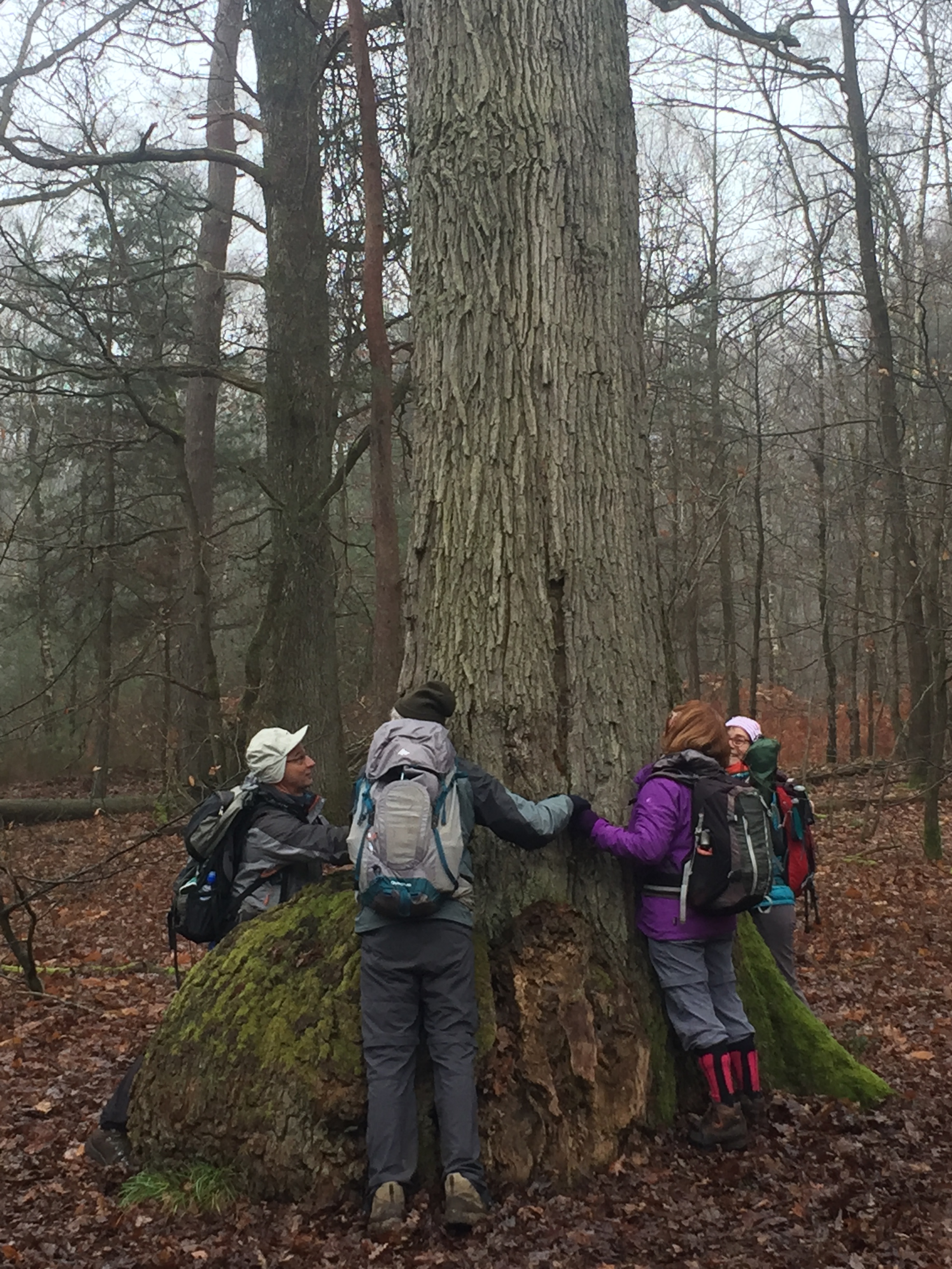 Déjà les premières visions suspectes apparurent. Certains s’étonnèrent d’une baisse soudaine de luminosité, d’autres dont Edward manifesta une envie irrépressible de cloper, Geneviève vacilla sur son siège pliant, j’eus mille difficultés à me remettre debout. Rare, Michel jeta son restant de salade à l’escadrille de canards. C’est à cet moment que Christian profita de ce flottement pour sortir l’arme fatale d’une poche secrète : une fiole d’aluminium remplie de rhum ! Malgré cet état collectif pitoyable, le groupe se remit en marche et rejoignit les bois. Alors que je nous croyais tirés du coma, Robert appela les randonneurs à encercler un arbre exceptionnel classé « remarquable de catégorie 3 * « .