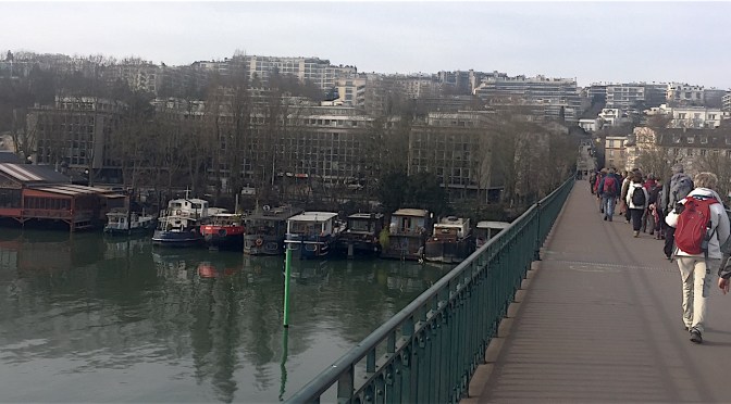 Sortir de Paris pour aller marcher sous le soleil, c’est déjà sortir de l’hiver . Nul besoin d’aller très loin, il suffit de prendre le métro , descendre à Porte Maillot et rejoindre le Bois de Boulogne à deux pas. Le GR1 est juste à côté du périph, suivez les marques familières rouge et blanche pour pénétrer dans ce grand espace de verdure. Ce chemin de Grande Randonnée serpente en suivant un cours d’eau jusqu’au petit lac qui surplombe la Grande Cascade. Il vous conduira jusqu’au bord de Seine. Vous longerez le fleuve sur quelques centaines de mètres avant de le franchir par la Passerelle de L’Avre. Il y a un joli petit port sur l’autre rive ainsi que le chicos restaurant Quai Ouest . On traverse ainsi une partie de St Cloud par le coteau avant de pénétrer dans le Domaine National par l’entrée Nord. Vous aurez parcouru déjà une dizaine de kilomètres , pourquoi pas quitter le GR1 et improviser un pique-nique au calme sur les hauteurs. La vue est splendide et ce sera l’occasion de découvrir les nouveaux aménagements de l’Ile Seguin au loin (anciennes usines Renault Billancourt) . Après cette pause, vous devrez rejoindre à nouveau le GR1.