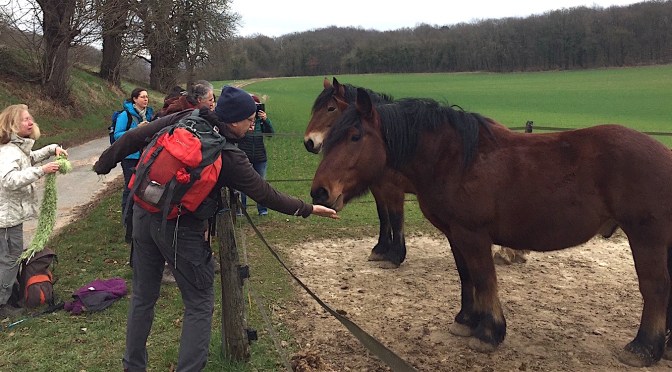 Soyons objectif, la rando en février est un peu ingrate. La nature a du mal à se débarrasser de son manteau gris, les terres se refont une santé en jachères. Alors les randonneurs semblent errer dans la steppe balayée par un vent frisquet à la recherche d’un endroit abrité pour leur pique-nique. Quelques courageux cavaliers des nombreux clubs locaux bravent aussi un hiver tirant gentillement sa révérence.