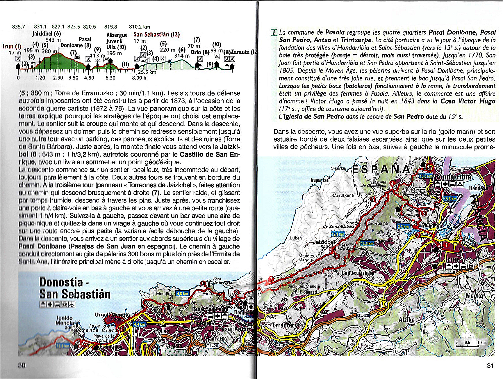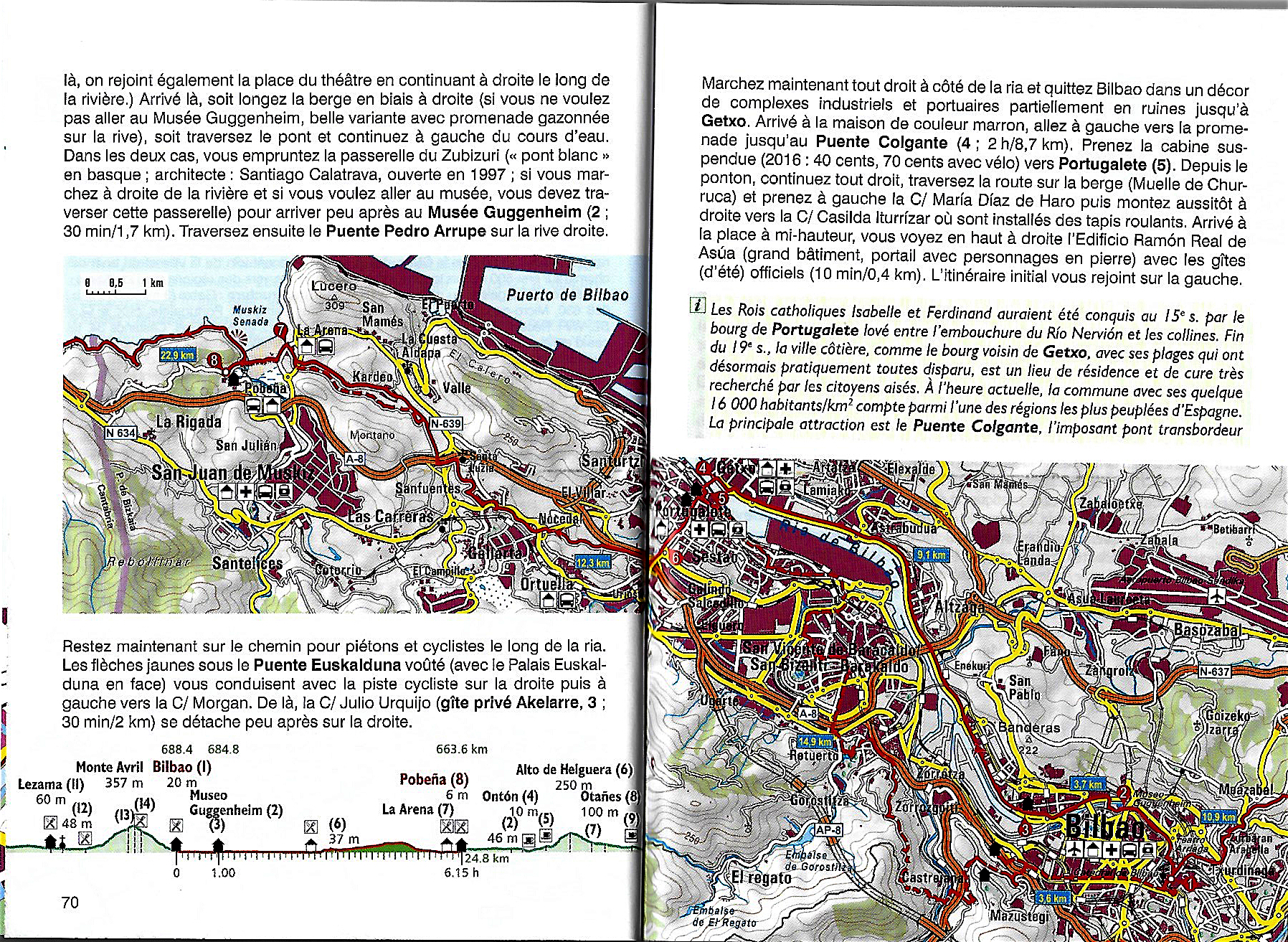 la partie vraiment novatrice concerne le profil des étapes. D’un seul coup d’oeil le marcheur visualise sur une échelle graduée en heures de marche et en kilomètres sa progression et les dénivelées du parcours, mais aussi la présence des facilités évoquées . Chaque villes ou villages comporte un numéro que l’on retrouve dans le texte courant. L’auteur guide le pélerin presque pas en pas en fonction des changements et repères de direction. Ce guidage est particulièrement utile dans la traversée des grandes villes, des passages où l’on se perd souvent quand le fléchage jaune ou les coquilles disparaissent soudainement !