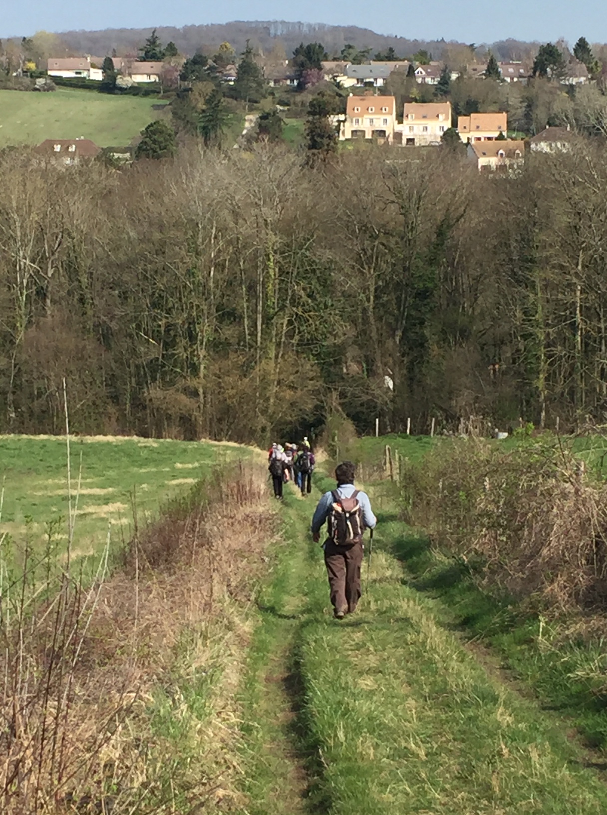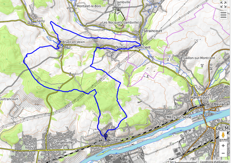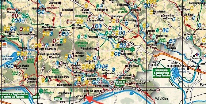 Les randonnées dans le PNR vous feront découvrir un panorama assez typique composé de plaines fertiles à perte de vue, des villages blottis au fond des vallons, un patchwork de petits bois et puis un réseau de rivières, autant d’affluents et de sous affluents qui alimentent la Seine . Il existe près d’une vingtaine d’itinéraires de balade proposée par le site officiel www.pnr-vexin-francais.fr .Lors de cette sortie de 23 km, organisée par Thérèse du club Randif , nous sommes partis de la gare de Juziers l’un des 6 villes-portes du PNR, à l’extrême sud. La guide avait concocté son propre parcours avec l’idée de quitter parfois les chemins balisés ( GR ou PR) afin d’éviter la foule des randonneurs qui investit la région dès les beaux jours. Alors investissez 11€ dans la carte IGN 2212 O et tracez votre propre route de randonnée en boucle ou en visant une gare de retour.