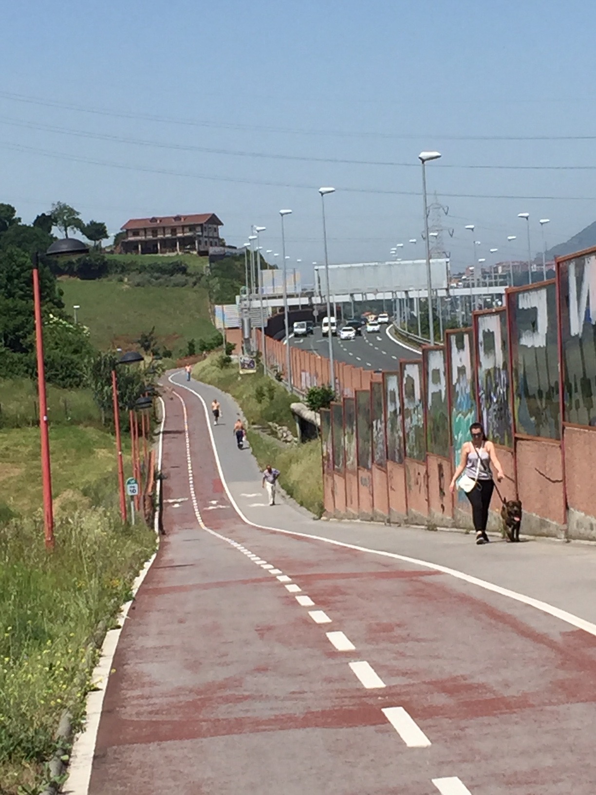 sera la seconde région à parcourir sur 200 km. Le relief s’assagit, on longe désormais souvent l’océan et il est bon de prendre un verre en terrasse dans un petit port. Toutefois le tracé du camino vous entraîne insidieusement aussi vers de « belles plages ». Une jolie route descendant vous mène joyeux vers la grève, une balade qui se paie cash au retour par des grimpettes exténuantes ! Trois, quatre plages dans la journée et la dénivelée cumulée s’avère copieuse. L’arrivée dans les Asturies marque la fin des longs jours sur des portions goudronnées très traumatisantes pour les gambettes, notamment lorsque le soleil chauffe le bitume. C’est avec bonheur que l’on retrouve les sentiers abrités. Toutefois j’ai aimé la traversée des villes contrairement à certains pèlerins qui ont pris par exemple le tramway pour sortir de Bilbao et atteindre Portugalete en évitant les zones industrielles. Quel dommage, car elles sont les témoins de l’histoire industrielle de ce pays. Ce décor composé d’acier rongé par les ans et de bâtiments en décrépitude ne manque pas de charme et mérite que l’on s’y perde sur quelques kilomètres avant de replonger dans la nature avec un plaisir décuplé. C’est le sens même du camino à mon avis. Hasard, Bilbao fut l’occasion de nombreuses retrouvailles dans l’albergue principale de la ville. Des Français, une américaine, deux autrichiens, un allemand, un italien .. Mieux vaut parler anglais vers Compostelle . La soirée se prolongea tard. Tapas, bières, glaces , le groupe cosmopolite savoura la profusion de bars débordant d’une jeunesse espagnole sonore dans un climat presque estival.