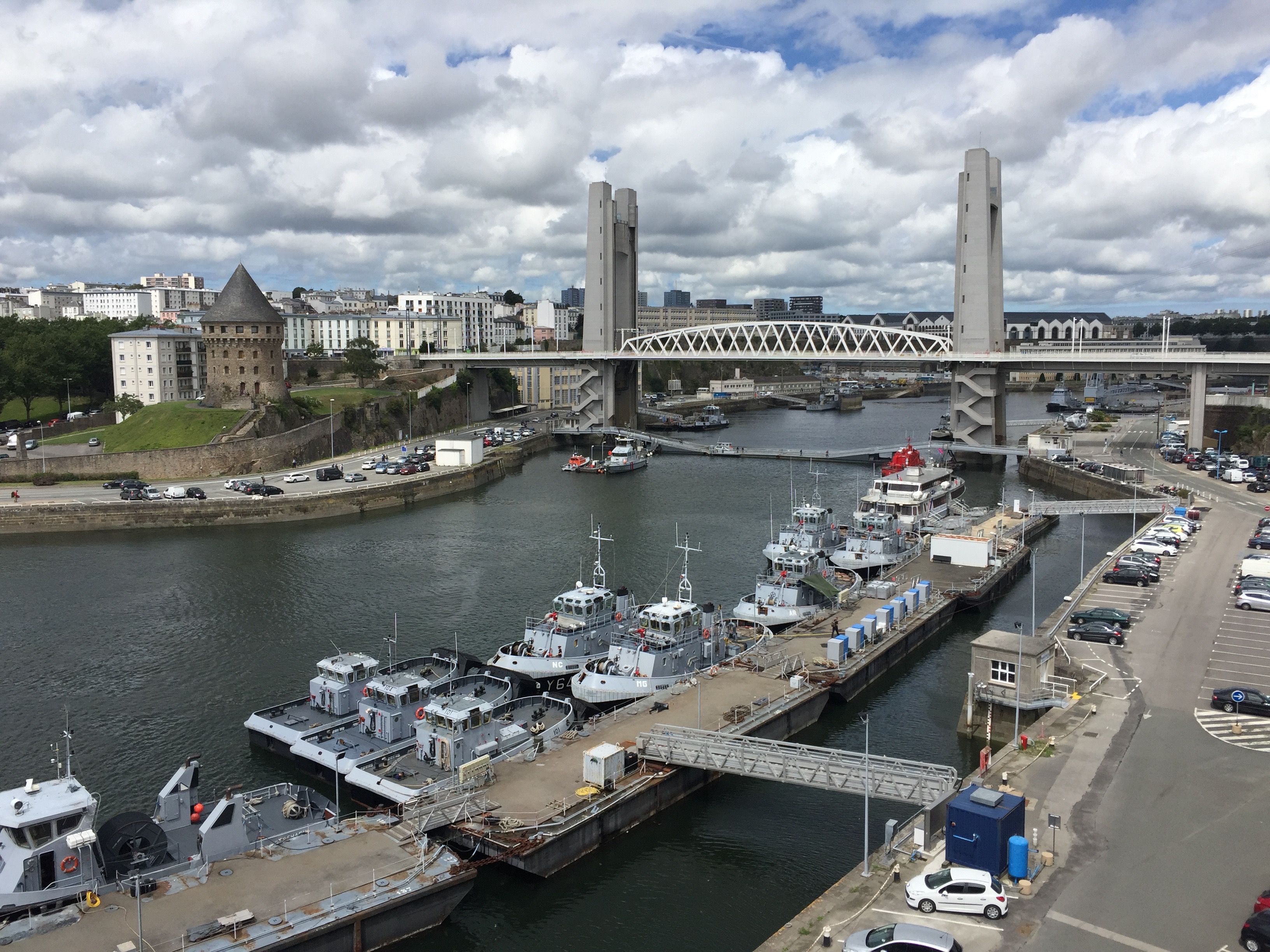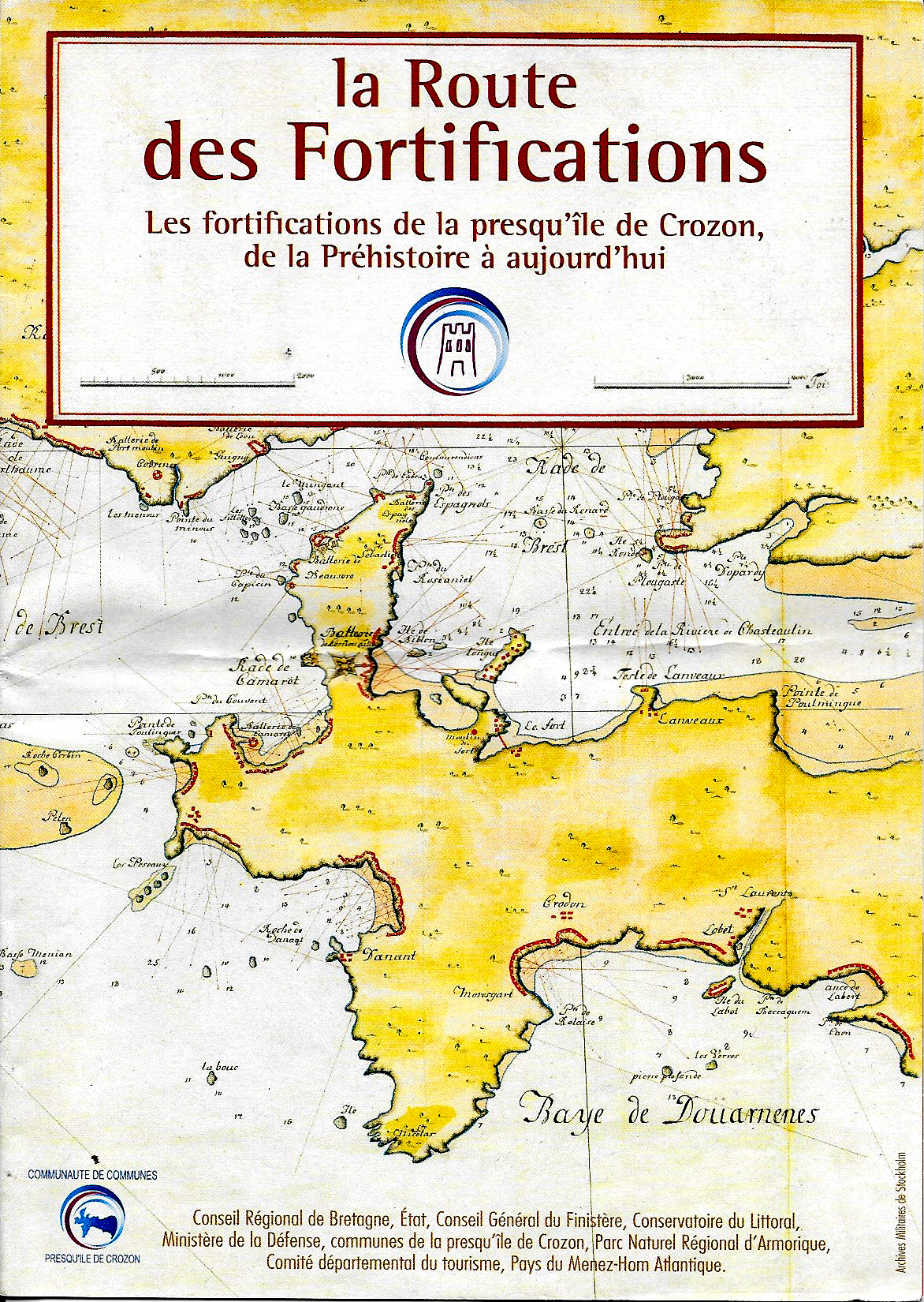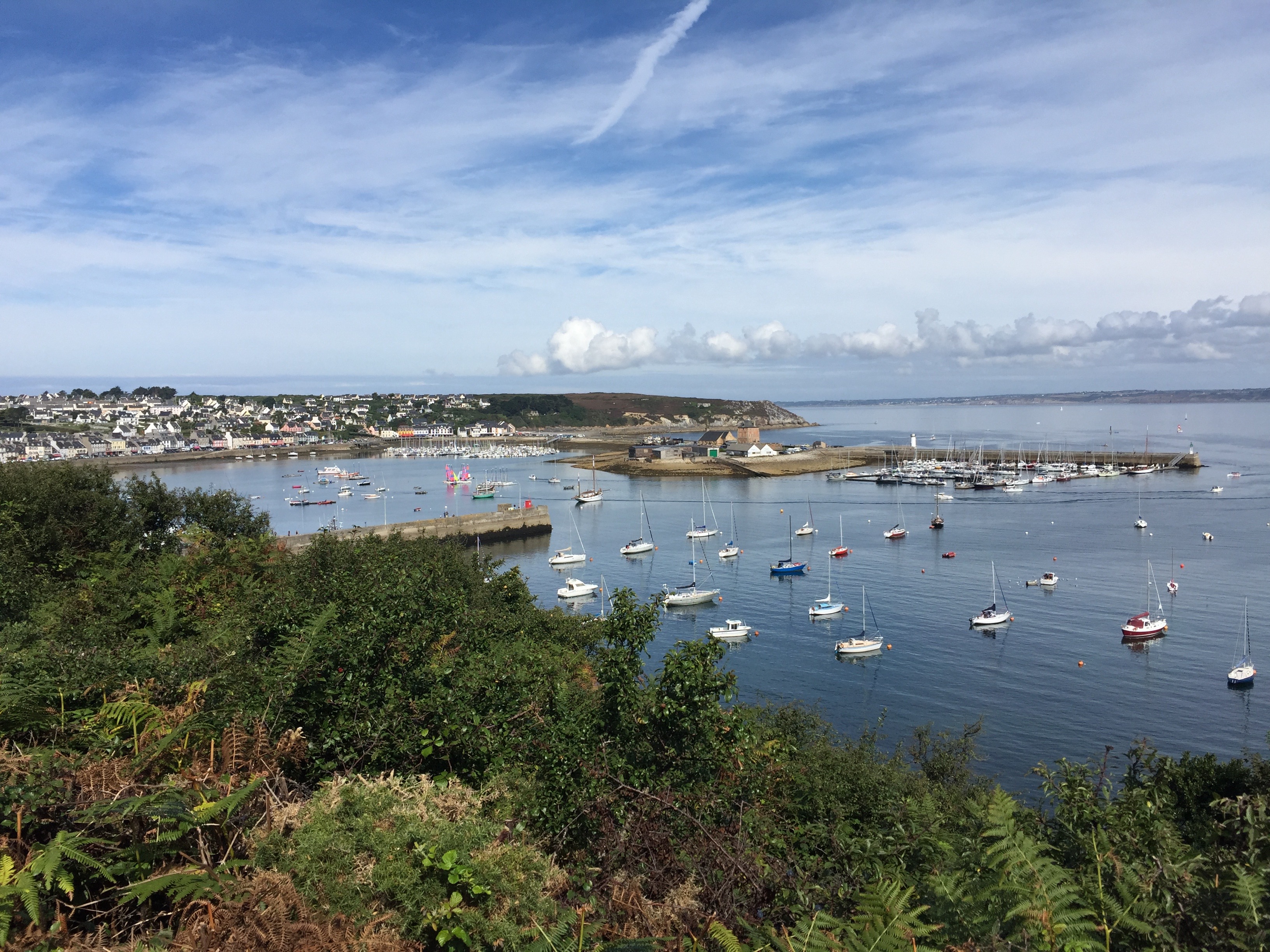 par la face nord depuis Landévennec en bus. Le réseau de cars du Finistère est génial. Vous circulez partout dans le département pour le tarif unique de 2€ (excepté entre Brest et Quimper). Hélas les horaires de la ligne Brest-Camaret sont rarement synchro avec ceux des trains venant de Paris. Et surtout, damned, elle ne dessert pas Landévennec ! Mauvaise pioche. Le département paie cependant le taxi pour vous y rendre depuis un arrêt à 7 km. Bon gré mal gré, je suis resté en rade.. de Brest pour quelques heures, suffisamment de temps pour déjeuner sur le port et visiter le Musée Maritime situé dans le château. La vie de Brest ne cesse d’être brassée par les turbulences de l’histoire entre chantiers militaires, fortifications, destruction, reconstruction, un vrai bagne et un camp de prisonniers civils sur l’Ile Longue devenue une base de sous-marins, son École Navale, les explorations de Lapérouse et plus récemment les grands rassemblements de voiliers anciens. Après cette visite et une errance touristique en mode sherpa, le bus pour Camaret décolla enfin me déposa, en route comme prévu à 7 km du but, à un carrefour où un taxi arrivant de nulle part me prit en charge. Je retrouvais le GR34 à Landévennec, un petit port qui marque l’entrée de la presqu’île de Crozon. Pour une première nuit et une arrivée tardive je logeais au gîte d’étape communal. Une famille de la région parisienne y faisait escale et cuisinait un repas sommaire. Je me remis au régime local dans la seule crêperie du village. Je ne saurais trop vous conseiller ici l’Océane, à base de saumon, thon et sa salade .