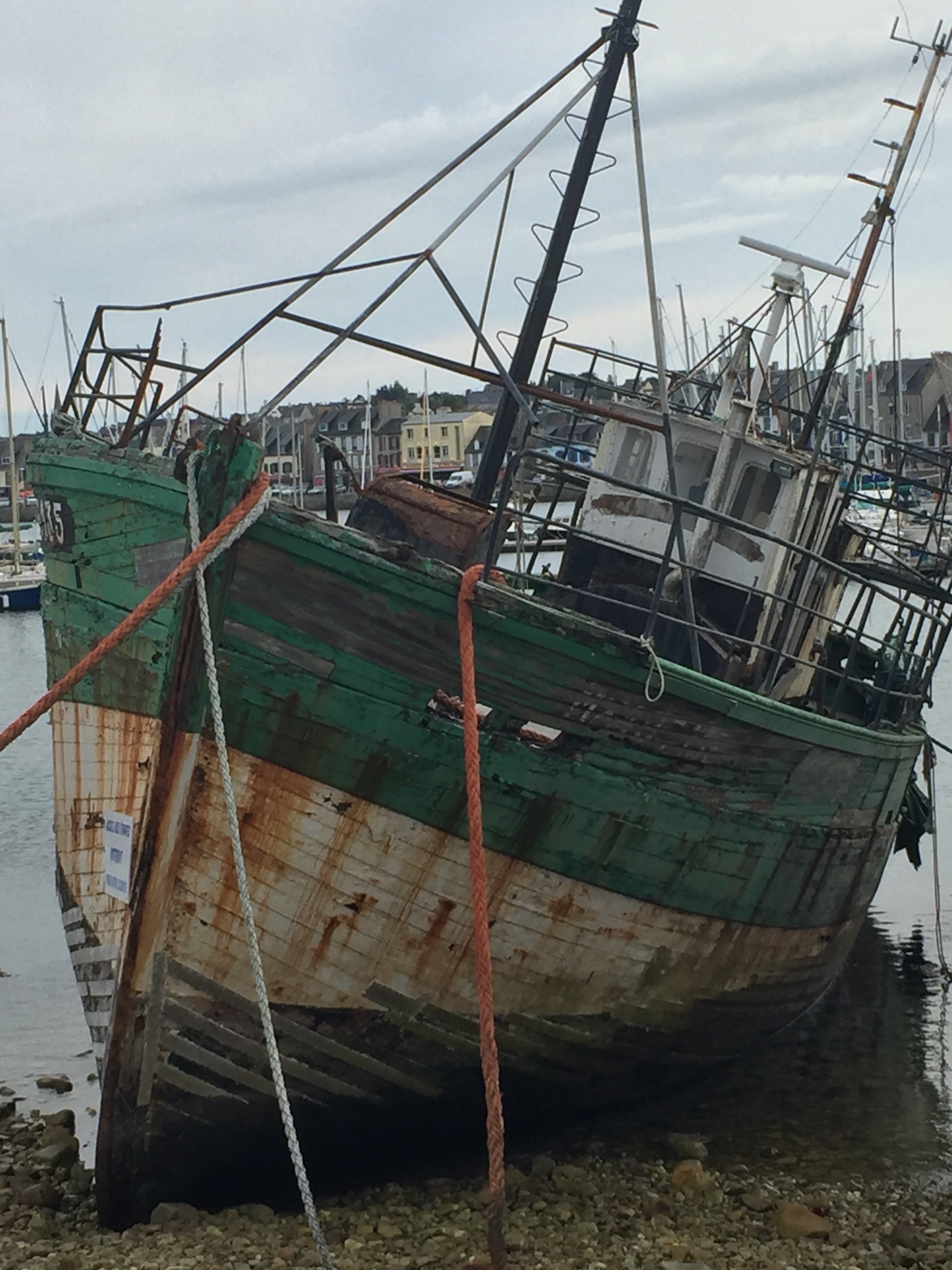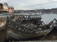 Il fallut tailler malgré tout la route. J ‘avalais deux Doliprane et partis fébrile vers Camaret sur la nouvelle portion du GR34 qui englobe dorénavant toute la presqu’île de Roscanvel. Le parcours côtier d’une dizaine de kilomètres se révéla idéal pour cette journée d’enrhumé. Je stoppais dans l’unique pharmacie faire le plein de Kleenex et dans une supérette pour un nouveau shopping alimentaire avant de me diriger vers le camping municipal de Lannic situé à proximité de l’ Auberge de Jeunesse. (Info – L’ accueil dans ces établissements passe par l’achat obligatoire de la carte d’adhésion annuelle. La nuitée coûte aux alentours de 22€ en haute saison. Moins cher pour les groupes). Une fois installé vers les 17 h, j’en profitais pour marcher le long des quais et notamment la digue où siègent l’église ND de Rocamadour , la tour Vauban et de splendides épaves de chalutiers, des stars locales croquées par les dessinateurs en balade. A l’heure du diner, le centre ville de Camaret fut pris d’assaut très tôt et je me retrouvais un embouteillage compact de badauds affamés et de voitures.