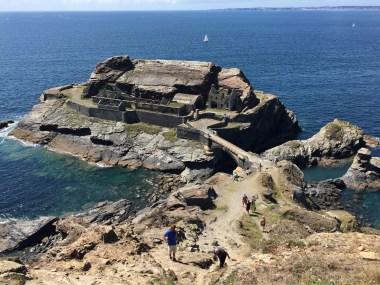 Une fois débarrassé de ma charge de mulet, je pris la route de la côte pour aller voir de près deux forts que l’on m’avait conseillés. Le sentier bien balisé me mena jusqu’à la pointe des Capucins. Imaginez un fort planté sur un rocher relié par un pont étroit au rivage, des ruines inquiétantes qui lui donnent un air de château hanté . Ce décor a tout pour séduire un cinéaste , ou devenir le terrain de jeu de Lara Croft dans Tomb Raider. Je laissais quelques touristes aventureux descendre une pente ultra raide et mal pavée jusqu’à l’édifice et poursuivais ma rando jusqu’à la Pointe de Cornouaille et sa forteresse. Le site en contre-bas est en cul-de-sac et oblige le visiteur à descendre et gravir près de 200 marches. Sympa avec déjà 22 km dans les jambes depuis le matin ! Le circuit des forteresses se conclut généralement par la Pointe des Espagnols et sa vue imprenable sur Brest. Sans moi ! Je rentrais au camping par les terres et réservais un table à la crêperie de Roscanvel. La nuit fut polaire et je réveillais les tentes voisines dans un concert d’éternuements irrépressibles. Une gentille crève en plein mois d’août, en rando et en camping .. Pas mal .