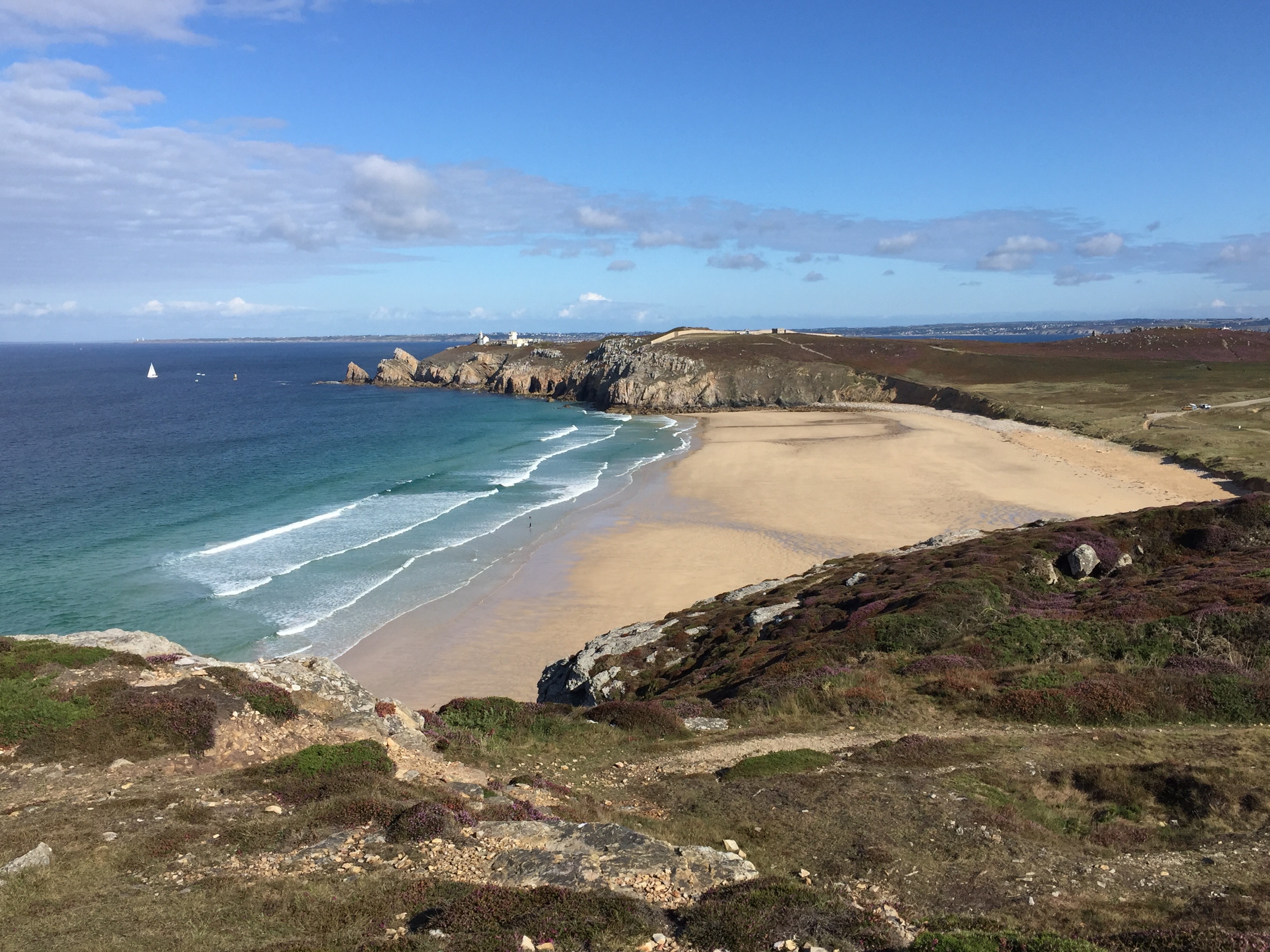 Si ce chemin de grande randonnée n ‘est pas l’ Everest il faut toutefois jongler avec les distances, un rapport de poids sac/bonhomme irraisonnable, une dénivelée trompeuse , le nombre réduit de campings ou de gîtes abordables, les épiceries aléatoires ou encore les incontournables crêperies. J’avais quitté le GR 34 à Brest l’ an passé un peu lessivé par le crachin breton. La presqu’île de Crozon était la suite obligée et attendue, tant cette région est un petit paradis pour randonner entre ciel et mer.