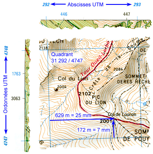 1 ) On repère en premier lieu le quadrant dont le coin inférieur gauche est (292 et 4747) en repérant ces chiffres sur les marges horizontale et verticale de la carte.