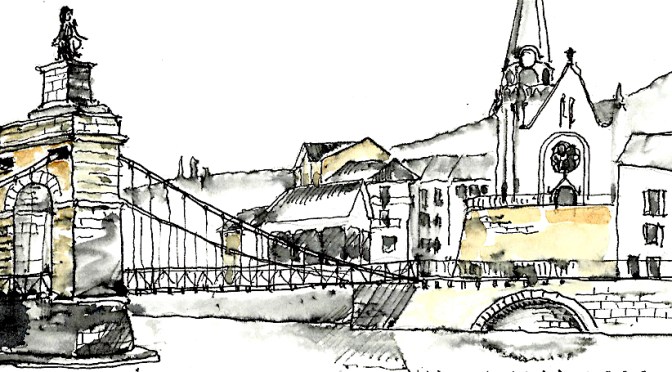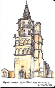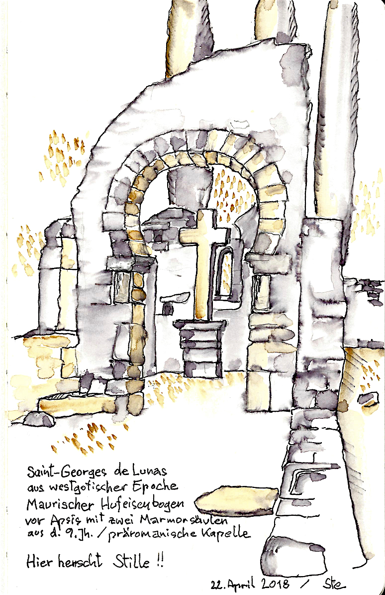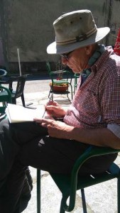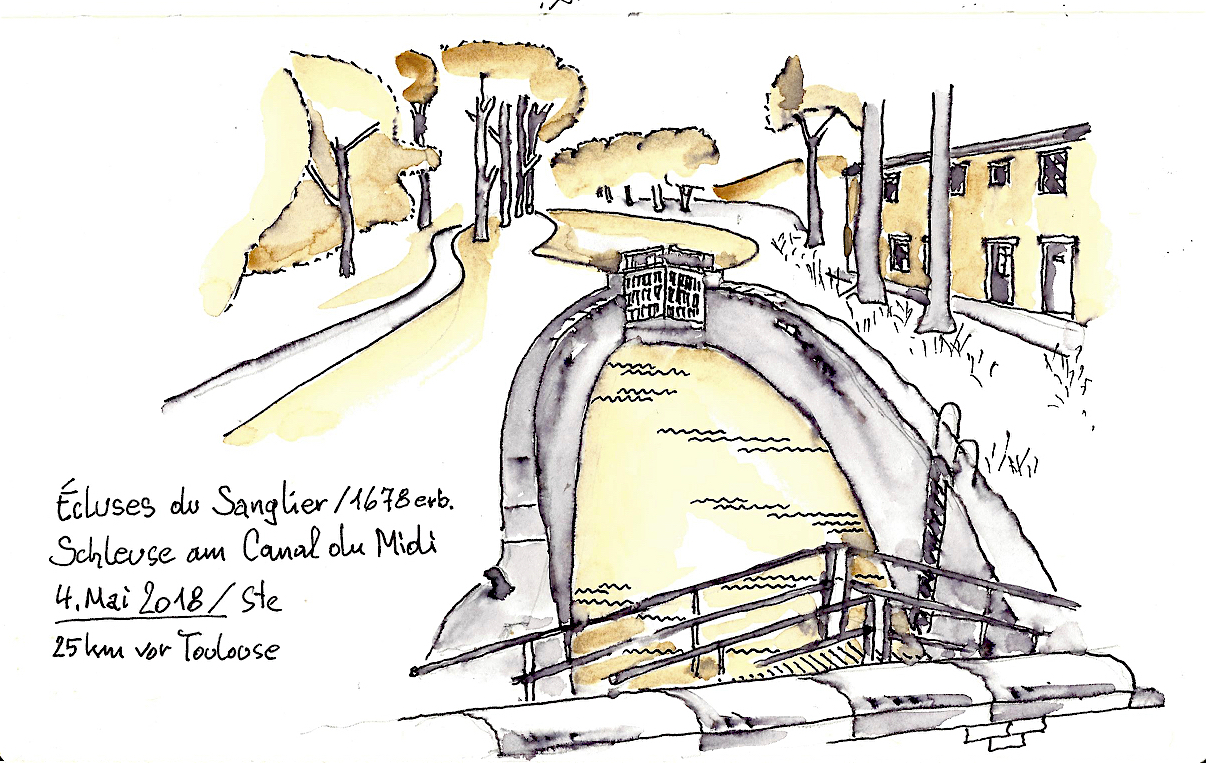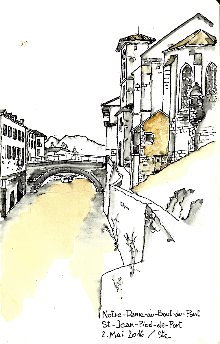 Les chemins de Compostelle sont toujours l’occasion de rencontres passionnantes . C’est à Saint-Julia que j’ai fait la connaissance de Gerald et de sa femme, comme çà simplement , autour de la table du petit déjeuner dans un gîte confortable planté sur une colline du Gers. Le couple venait d’Autriche, comme Hans Peter , mon compagnon  suisse de route  et de hasard nous étions tous les quatre parti  d’Arles sur le GR653 en direction de Punte La Reina en Espagne.  Après quelques échanges, alternant l’anglais et l’allemand  histoire de faire connaissance, Gerald ouvrit naturellement un carnet de moleskine sous mes yeux . Je lui demandais alors de le parcourir, et c’est avec surprise que je découvris que derrière ce pèlerin jusque là anodin et discret se cachait un artiste . Depuis 2015, cet ancien architecte de 70 ans, vivant aujourd’hui dans une vallée viticole proche de Vienne, dessine désormais pour son seul plaisir sur les chemins jacquaires de France et d’Espagne, en consacrant à cette passion de 30 à 45 minutes par jour environ. Alors que la plupart des randonneurs au long court se concentre sur la longueur des étapes ou shootent avec frénésie des centaines de photos numériques, Gerald savoure le temps d’une pause et prend le temps de fixer sur ses carnets la beauté des édifices ou des décors qui rythment son parcours. Equipé de Rotring et de quelques peintures à l’eau, l’ex-architecte devenu marcheur perpétue l’art du carnet de voyage en mettant à profit un sens aigu de l’observation propre à son ancien métier. Une fois le dessin terminé, il le complète d’une fine légende dont l’encre de Chine relève encore la finesse de l’ensemble. J’ai feuilleté ce carnet  jusqu’à la dernière page et je l’ai refermé encore sous le charme de ce chemin d’Arles coloré. Mais au-delà des croquis j’ ai aussi découvert ce matin-là une autre philosophie du voyage, celle d’un pèlerin libéré du temps. Plusieurs de ses dessins m’ont aussi révélé des  lieux  où j’étais passés sans rien voir de leur intérêt, en randonneur trop pressé .