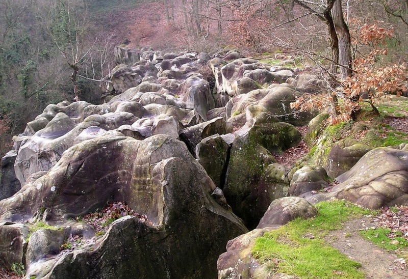 Bien desservies par le RER B, la vallée de Chevreuse et celles des rivières du bassin de la Meauldre comme  l’Yvette ainsi que le plateau d’Orsay très boisé  constituent un formidable terrain de jeu pour les randonneurs d’Ile-de-France.  De nombreux  chemins parfaitement balisés vous permettront de tracer facilement une foule d’itinéraires dans cet espace à cheval sur les départements des Yvelines et de l’Essonne. Vous emprunterez  peut-être le GR655 Ouest qui  vous menera tout droit vers Compostelle ! Programme plus modeste, au départ de la gare du Guichet,  je vous propose ce magnifique parcours d’une vingtaine de kilomètres particulièrement varié pour en découvrir toutes les facettes. Lors de cette balade vous traverserez le campus d’Orsay, l’un des cinq sites de l’université Paris-Sud, qui s’étend sur la commune d’Orsay mais aussi de Bures-sur-Yvette et de Gif-sur-Yvette, dans l’Essonne, à une vingtaine de kilomètres au sud-ouest de Paris. Il accueille plus de 13 000 étudiants et 1 700 enseignants-chercheurs.  Ses nombreux bâtiments d’enseignement et ses 60 laboratoires de recherche se répartissent sur 200 hectares de bois contenant de nombreuses espèces rares (source Wikipedia). Lors de cette longue balade, vous découvrirez deux autres endroits originaux. Tout d’abord la carrière de  La Troche. Cette entreprise  appartenait à la famille Pigeon à la fin du XIXème siècle. Elle y employait 25 à 30 ouvriers dans la fabrication des pavés parisiens d’une vingtaine de tailles différentes.  Le travail s’interrompait au moment des moissons car les carriers, très souvent, étaient aussi ouvriers agricoles. La production était descendue à Paris deux fois par jour depuis la gare de Lozère, dès 1867, par des charrettes tirées par 3 chevaux et chargées de 120 pavés (environ 2 tonnes). Puis en 1891 elle fut acheminée  sur des wagons grâce à une voie supplémentaire créée pour les marchandises. La carrière ferma ses portes en 1937. Située  à l’intérieur du parc Eugène-Chanlon, elle fait désormais le bonheur des grimpeurs qui profitent des trois voies sécurisées de niveau 4 à 8. Hasard, l’autre site remarquable concerne aussi l’escalade mais d’une façon plus inattendue. Le viaduc des Fauvettes se situe dans le vallon verdoyant et sauvage du ruisseau d’Angoulême entre forêt de châtaigniers et prairies. Il s’agit d’un viaduc ferroviaire désaffecté depuis la guerre de 1939-1945 sur lequel passe désormais votre  chemin de randonnée. Ce viaduc est essentiellement constitué de meulière très caverneuse,  une roche qui a en effet permis le tracé d’itinéraires d’escalade originaux et très diversifiés ; l’ouvrage propose plus de 130 voies  de 10 à 36 mètres de hauteur, dont plusieurs réservées aux enfants..A vos gratons !