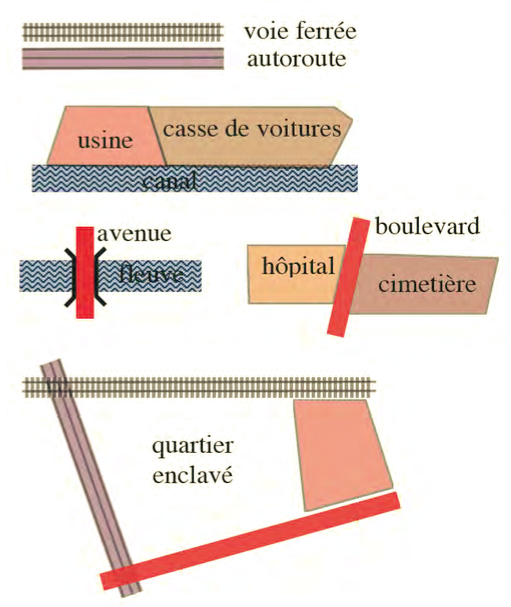 sans avoir réellement pensé aux rues pour s’y rendre à pied ! » Notre marcheur urbain et son cousin le cycliste connaissent actuellement des « moments de vie intense » dans ces métropoles si mal aménagées pour eux. Dans son ouvrage intitulé La Ville morcelée – Effets de coupures en milieu urbain Frédéric Héran enfonce le clou. Il a déterminé ainsi quatre types de coupure principaux qui compliquent la vie de ce marcheur et de ce cycliste.