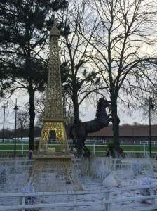 Salutations et politesse de rigueur, je quitte l’escale douillette et remonte l’avenue qui mène à l’entrée ouest du Parc de Saint cloud. Les allées majestueuses se perdent ici sur les quatre horizons. En marchant plein Est j’atteins le belvédère qui surplombe la Seine, Boulogne et plus loin la mégapole d’où émerge la Tour Eiffel et le quartier du front de Seine. Un groupe de randonneurs coiffés de la toque rouge du père Noël se sont installés sue les bancs face au panorama et en finissent avec leur déjeuner. Les clubs de rando senior + raffolent du folklore et des traditions. Le podomètre affiche 16km , il est près de 15h, le soleil décline et je dois rejoindre le parking des étangs où j’ai laissé mon scooter.