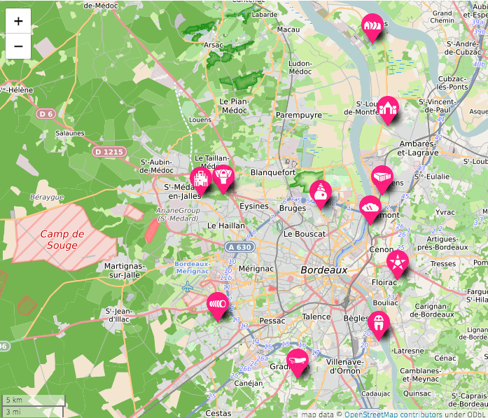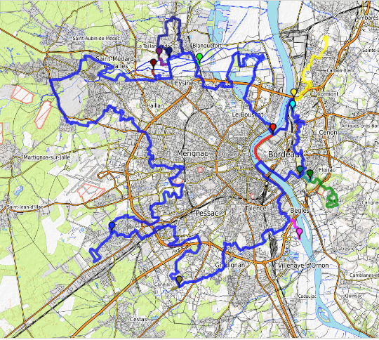 14 points de vue22 franchissements de rocade28 parcs, 22 zones pavillonnaires, 6 grands ensembles de logements sociaux, 5 zones commerciales, 4 zones industrielles, 2 zones humides, et 37 giratoires traversés