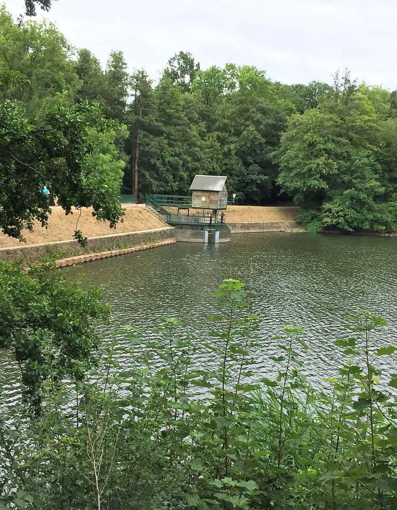 On franchit alors une seconde fois la N12 par un souterrain en direction des Anciennes Batteries de St-Cyr. En prenant un peu d’altitude sur la carte, on visualise bien la boucle réalisée autour du camp de Sartory. La route du Grand Bois puis celle des Châtaigniers suivent en parallèle la voie de chemin de fer du RER et Transilien. Notre premier objectif était d’aller pique-niquer au bord de la pièce d’eau des Suisses dans le célèbre château, un espace qui est libre d’accès. Un petit passage sous-terrain caché dans la verdure permet de franchir les voies ferrées et d’y accéder immédiatement . Ce bassin de 13 ha fut creusé de 1676 à 1682 par un régiment de Gardes Suisses d’où il tire son nom. Il fut crée pour assainir le terrain aux abords du Potager du Roi . Une sublime allée de platanes borde ce plan d’eau, un endroit idéal pour une pause bien abritée du soleil les chaudes journées d’été.