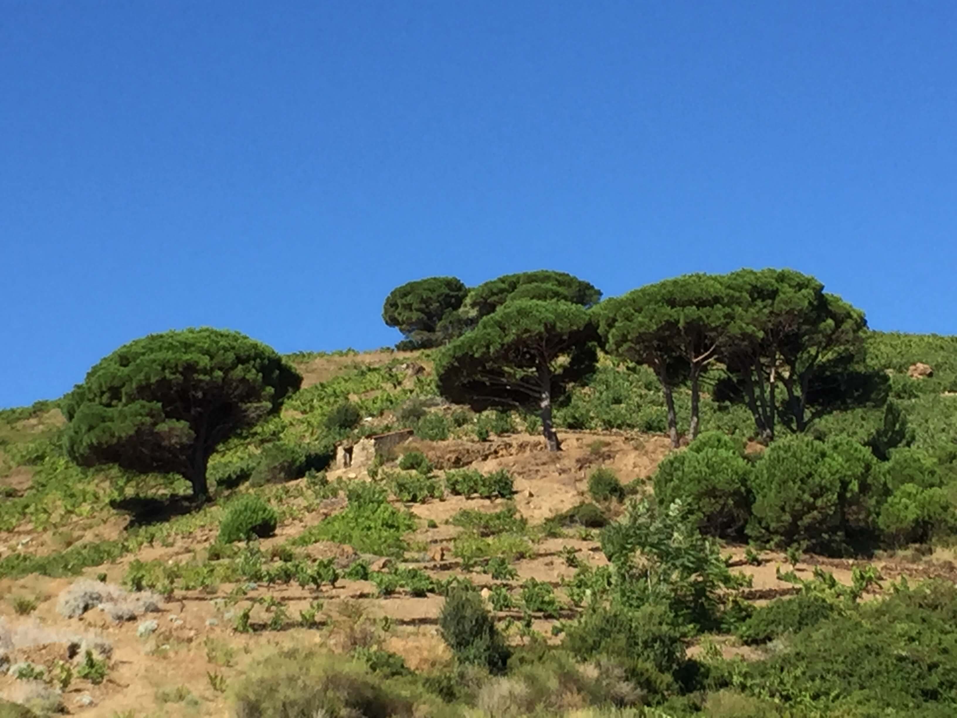 Bien installés sur notre terrasse devant un verre de vin frais de Banyuls et quelques toasts d’anchois, nous contemplions le paysage de vignes s’estompant sous le soleil couchant. Très loin, très haut, une chapelle blanche et un pin incliné semblaient inaccessibles et dominaient la baie. Après le sentier littoral, j ‘avais vaguement regardé le tracé de cette seconde randonnée de notre séjour. J’ignorais précisément que ce parcours nous conduirait jusqu’à ce clocher . (Murielle aussi ! ) .
