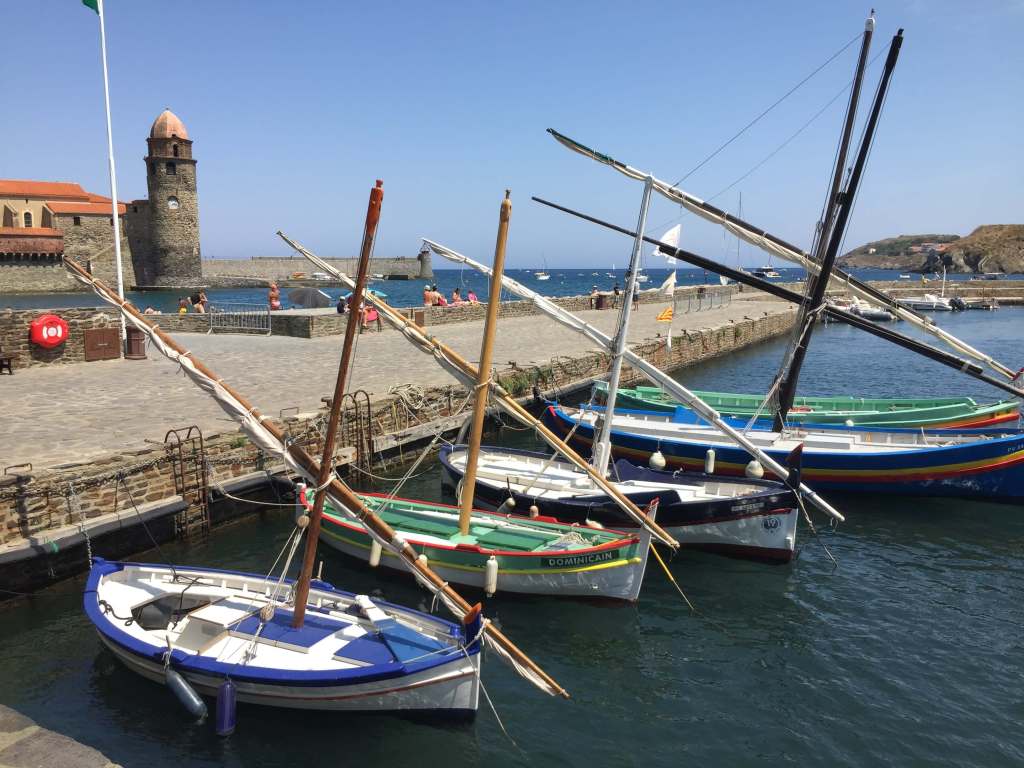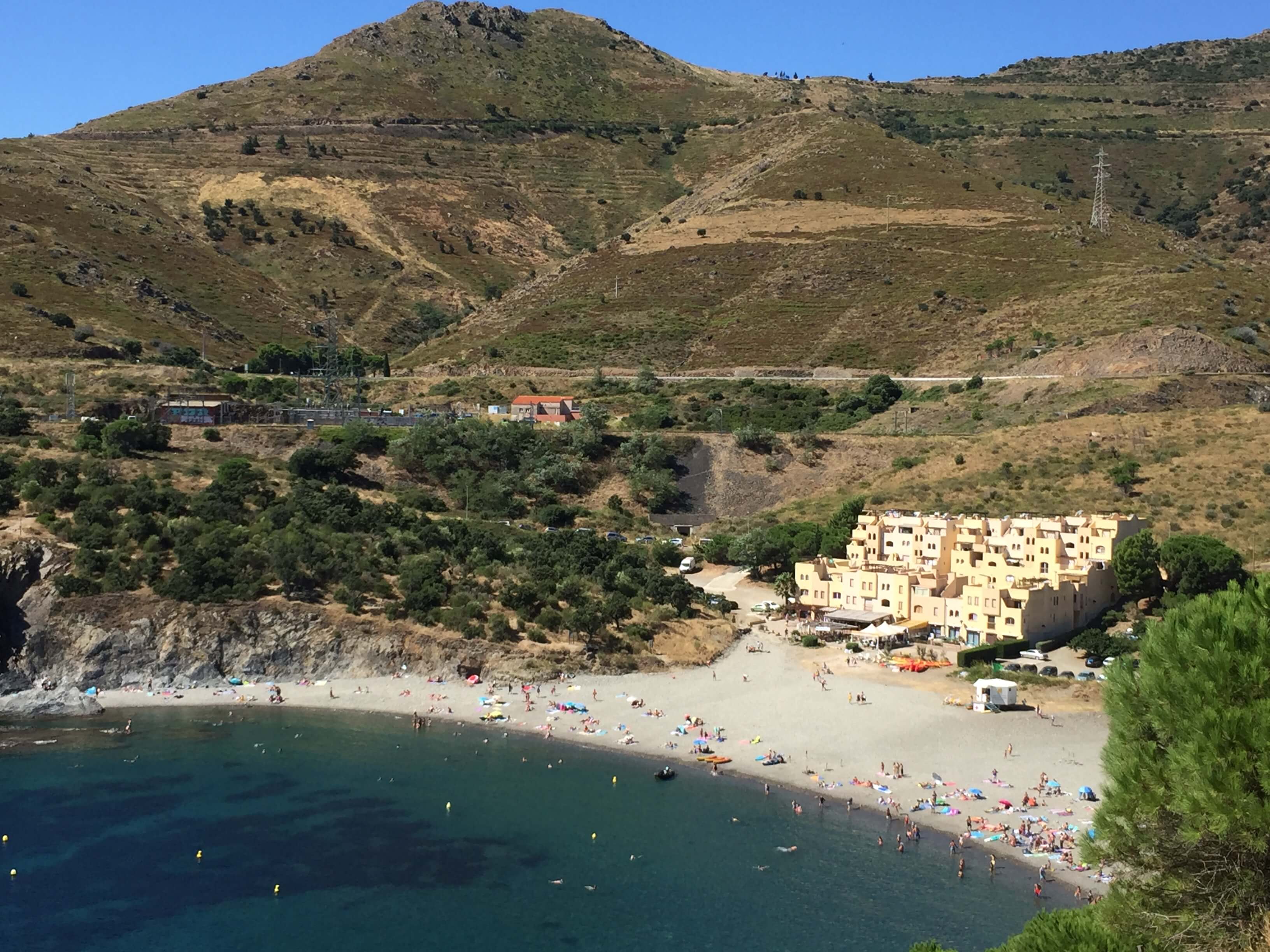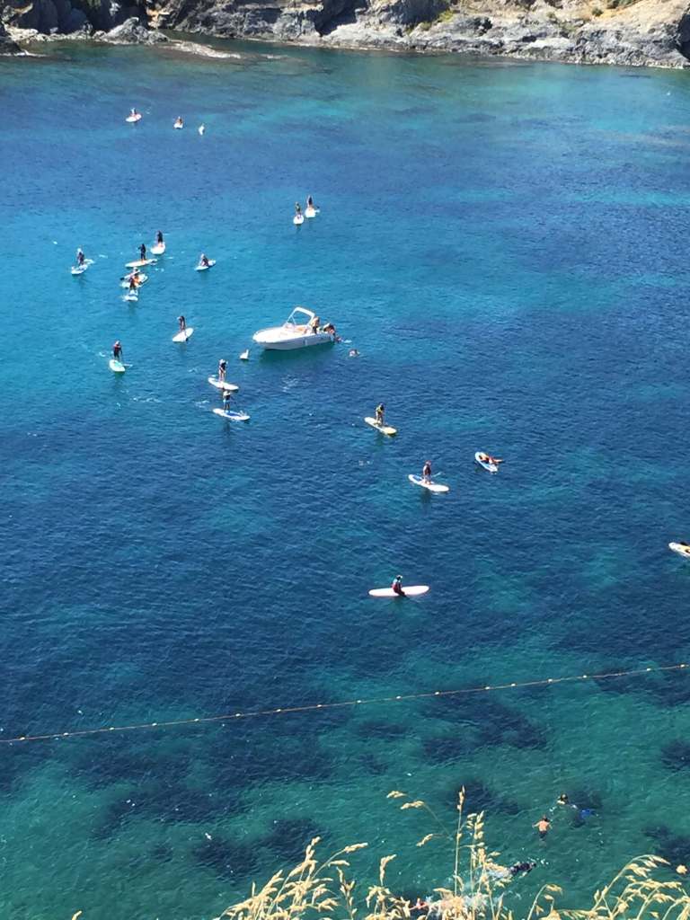 Nous cheminions parfois à près de 70 m au dessus des criques avant de descendre jusqu’au niveau des plages. Ici et là, des plongeurs s’équipaient pour explorer ces fonds réputés pour la flore et la faune. Les premiers groupes de kayakistes matinaux ou des flottilles de rameurs en stand up paddle investissaient les anses en silence. Le vent puissant des trois jours précédents n’était plus qu’un souvenir et les plaisanciers croisaient sereins entre ciel et mer d’un bleu sublime. Après 5 km de ces montagnes russes, nous sommes arrivés au Cap Peyrefite. Un chemin raide descend vers la plage blottie dans une large crique baignée de soleil où l’on distingue le balisage d’un sentier cette fois sous-marin que l’on suit avec masque et tuba. L’ombre se faisant rare et nous remontons sur l’autre versant pour dénicher un coin abrité pour pique-niquer. En contre-bas, les vacanciers profitent de l’eau claire et tiède ou se pressent à l’unique buvette . Débarrassés enfin de notre panoplie de randonneurs en surchauffe , quel bonheur de s’immerger dans cette eau limpide avant de reprendre le car pour Banyuls !