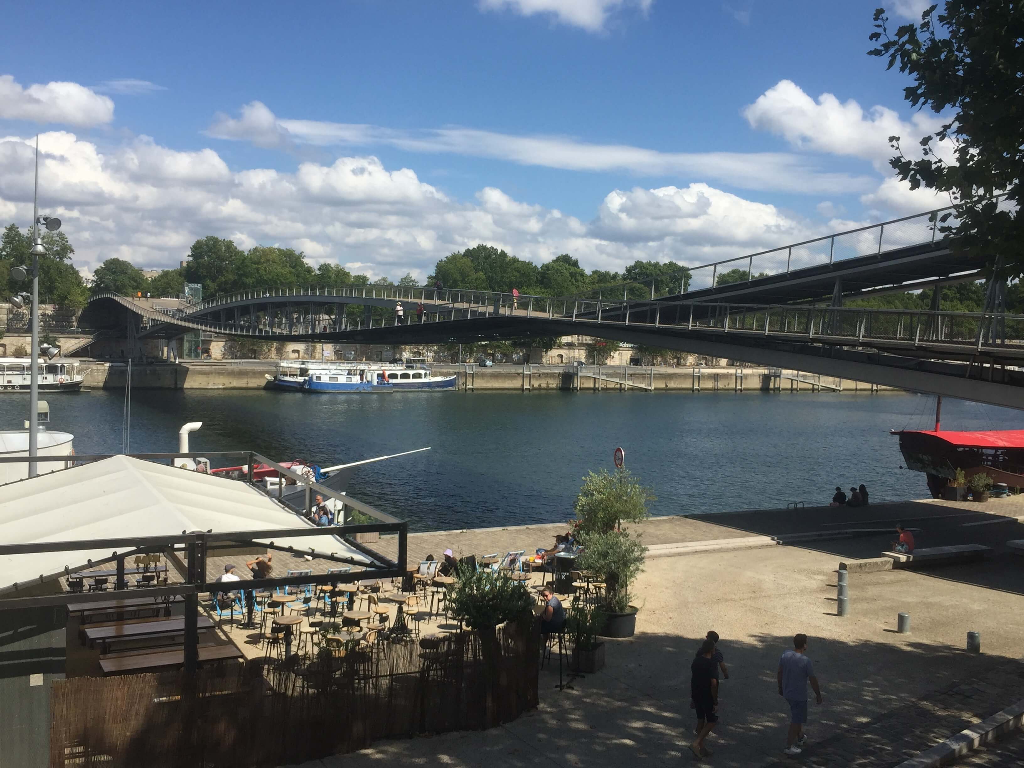 Les bouquinistes du quai n’ont d’autre activité que de bouquiner. Je traverse le long square verdoyant vers le pont d’Austerlitz parsemés de sculptures contemporaines, le quai semble ici s’animer de quelques visiteurs entre bronzette et causette . Je passe alors sous la Cité de la Mode et du Design, un ancien entrepôt remodelé qui fut jadis le repère crasseux de junkies et clochards en tous genres. Seuls quelques tags éclairent ce passage désormais aseptisé et ouvert aux promeneurs. Le nez en l’air, je me pâme sur mon chemin devant le bel ouvrage des passerelles et ponts du métro des années 1900. Le spectacle de la déchèterie de la brigade fluviale est moins reluisant . Des dizaines de Vélib et trottinettes repêchés par les plongeurs sont entassés sur la berge. Le libre-service parisien dans toute sa splendeur !