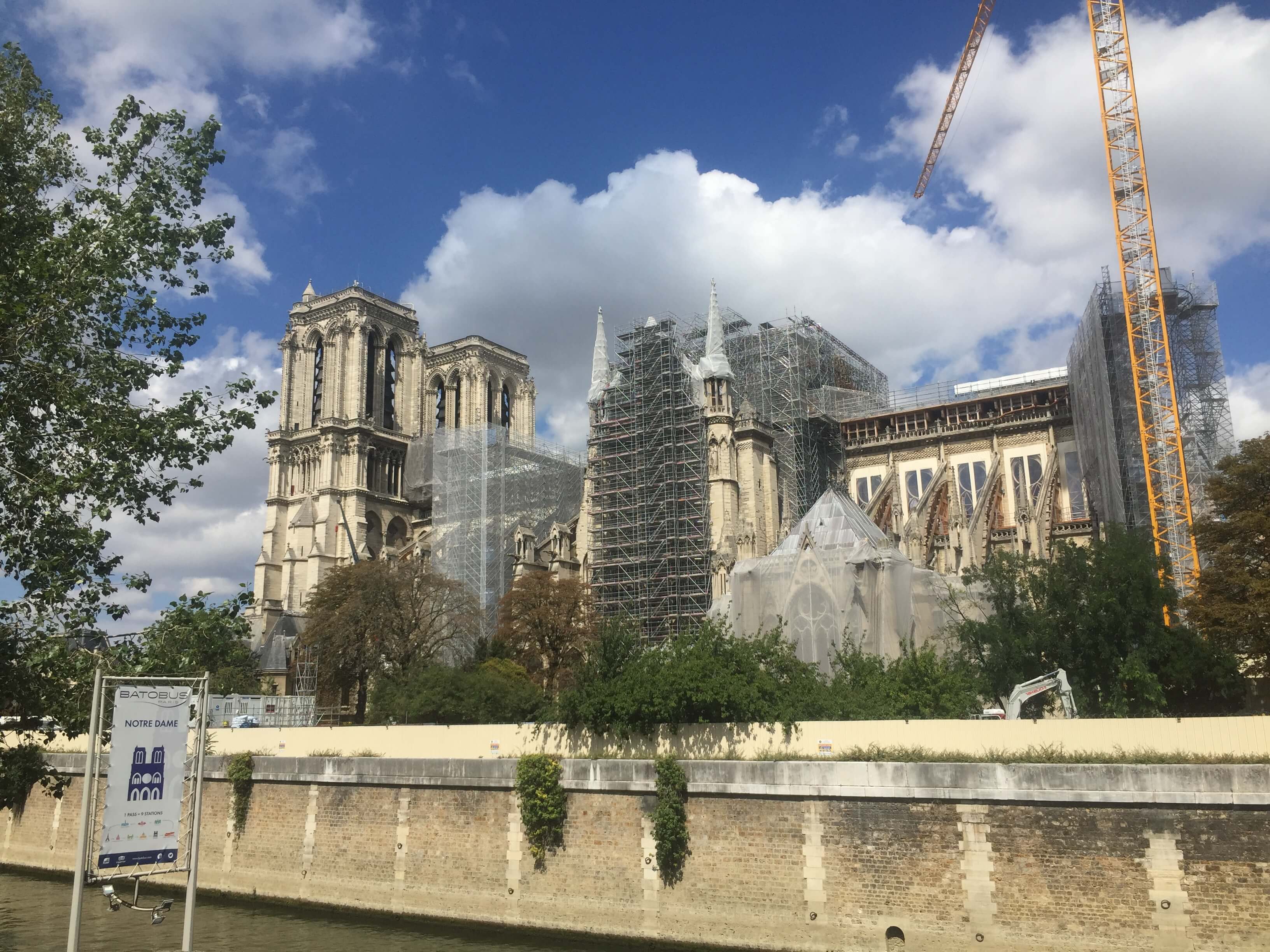 Planté sur sa pile de pont le fameux Zouave n’a jamais eu les pieds autant à sec tant la sécheresse affecte le niveau du fleuve. Je descends sur le quai rive gauche rendu aux piétons depuis des lustres et mets le cap à l‘Est. Un soleil inonde maintenant la ville, l’air est frais, l’Apple Watch indique une moyenne 11’54 au km, le rythme est bon . Sur l’autre rive, le port des Bateaux Mouche ne connait pas non plus l’effervescence habituelle des déferlantes touristiques et les bateaux- bus à moitié vides partent faire leur tournée des iles. Il est plus de midi mais les bistrots du quai ne font pas recettes. Les joggers et skaters de la passerelle Senghor ont désertés et mes amis du backgammon ne sont pas encore venus en découdre sur les tables de jeu du petit restau italien. Je passe mon chemin pour aller inspecter les travaux d’avancement de Notre-Dame. Le démontage de l’échafaudage calciné par l’incendie avance bien, plusieurs mois seront toutefois encore nécessaires pour l’achever.