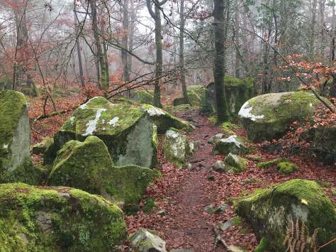 Le randonneur connait bien les pièges de leurs racines . Glissantes, luisantes, elles s’échappent du sol et ruissellent sur les pentes sablonneuses entre les feuilles mortes. Veillant à ne pas m’accrocher dans leurs anses cachées, je m’arrête pour admirer leurs ramures émergeant de la terre. Quel talent ! Depuis quelques temps, les fameux rochers de Fontainebleau se recouvrent davantage d’une mousse tendre verdoyante. Peut on y voir l’influence du réchauffement climatique ? Le végétal rejoint alors le minéral des blocs. Dans les passages étroits des sentiers Denecourt-Colinet balisés de bleu, ma main caresse parfois cette peau humide du calcaire.