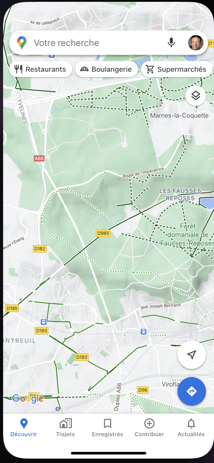 Voici un petit comparatif visuel sur la forêt de Fausses Reposes entre les différentes App et les 3 fonds de carte Géoportail, OpenStreetMap et Google.