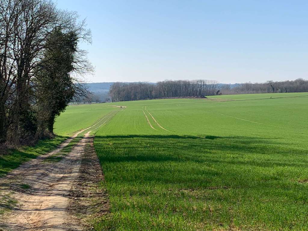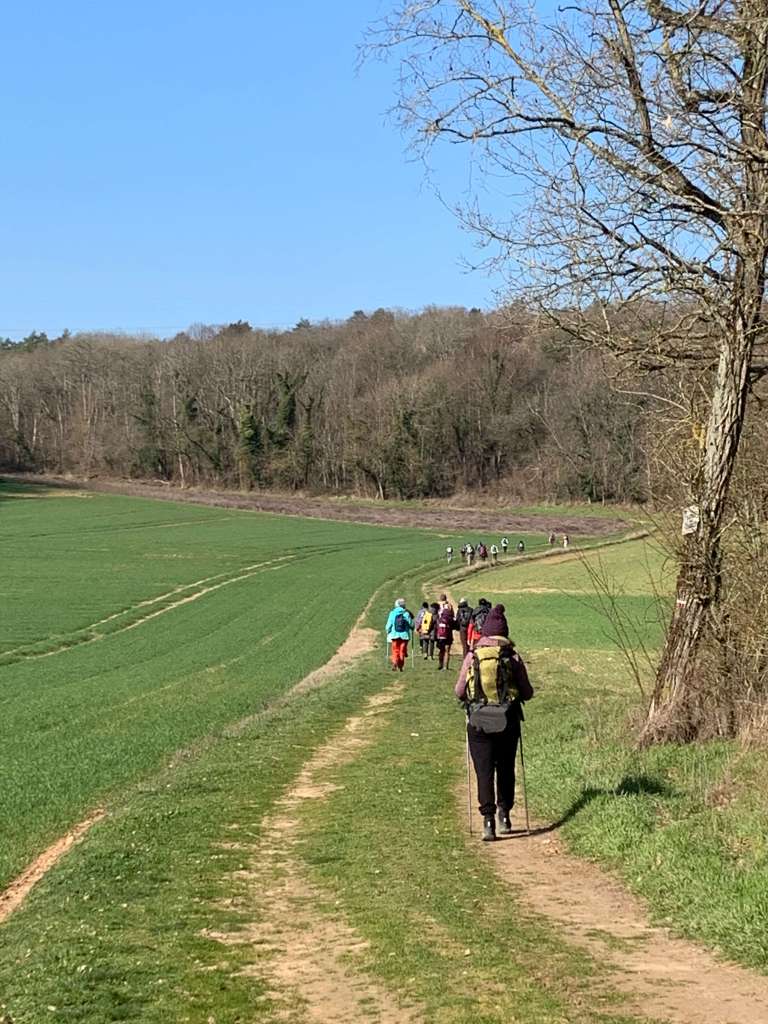 La Ferté-Alais endormie accueille à la gare les randonneurs matinaux d’Amigo Rando pour une boucle de 20 km. C’est encore l’hiver et pourtant la nature affiche ce dimanche les premiers signes de son éveil. Les grandes plaines agricoles de l’Essonne se couvrent d’un fin duvet d’un vert prometteur, un ton annonciateur du printemps tout proche. Le GR11 serpente ainsi dans ces champs infinis, entre les bosquets clairsemés qui laissent apparaitre les troncs abattus par les coups de vent de cet hiver et dont la mousse éclatante tranche avec la grisaille des branchages.