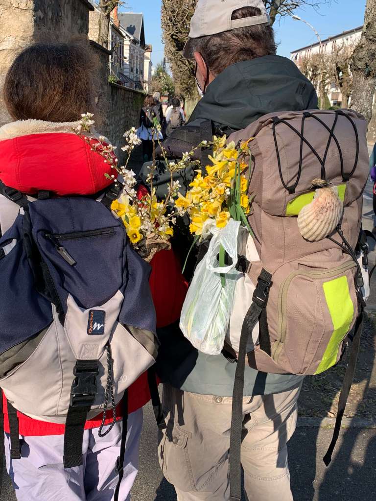 Chacune de ces sorties en Ile-de-France, cette vingtaine de kilomètres est comme un cadeau arraché au confinement, au destin parfois douloureux , aux années qui défilent. Notre sortie de la Ferté-Alais s’achève à cette même gare. La charmante ville ne semble pas plus éveillée qu’à notre départ, seul le quai s’encombre des voyageurs de retour vers Paris. Look de montagnards au sac à dos fleuri de jonquilles, les marcheurs d’Amigo Rando se mêlent sans complexe à la masse des banlieusards indifférents. Ereintés, certains comatent dans leur coin, d’autres poursuivent une discussion entamée parfois depuis vingt kilomètre avec un interlocuteur bienveillant, très très patient ! Ces retours de randonnées me semblent parfois brutaux, sans transition . Combien d’entre nous se repassent le film de la journée et prolongent ensemble la beauté inspirée par les images du jour ?? Hum…Bibliothèque François Mitterand , tout le monde descend, choc frontal avec le monde urbain. Les plaines de l’Essonne sont déjà loin mais les semaines à venir pleines de promesses.