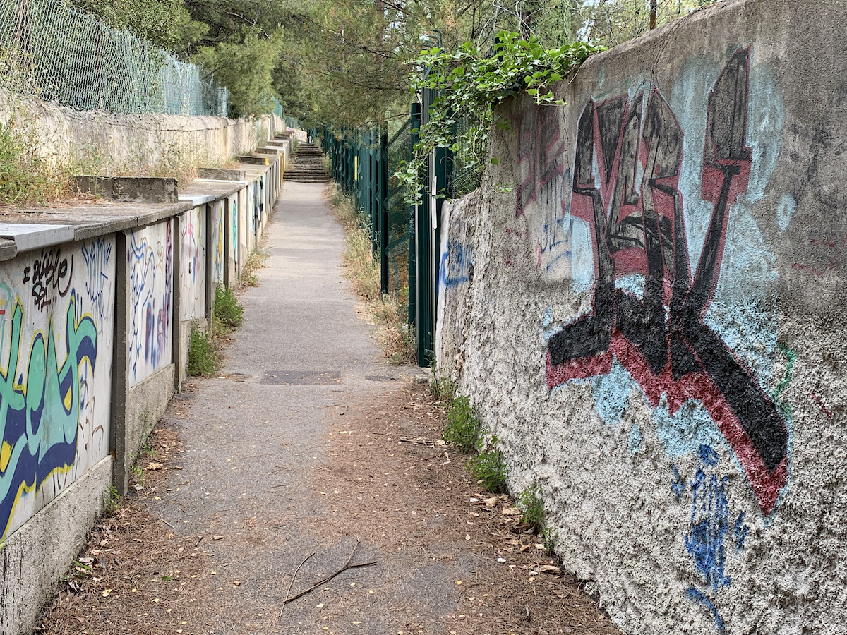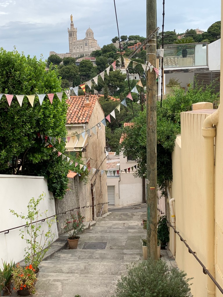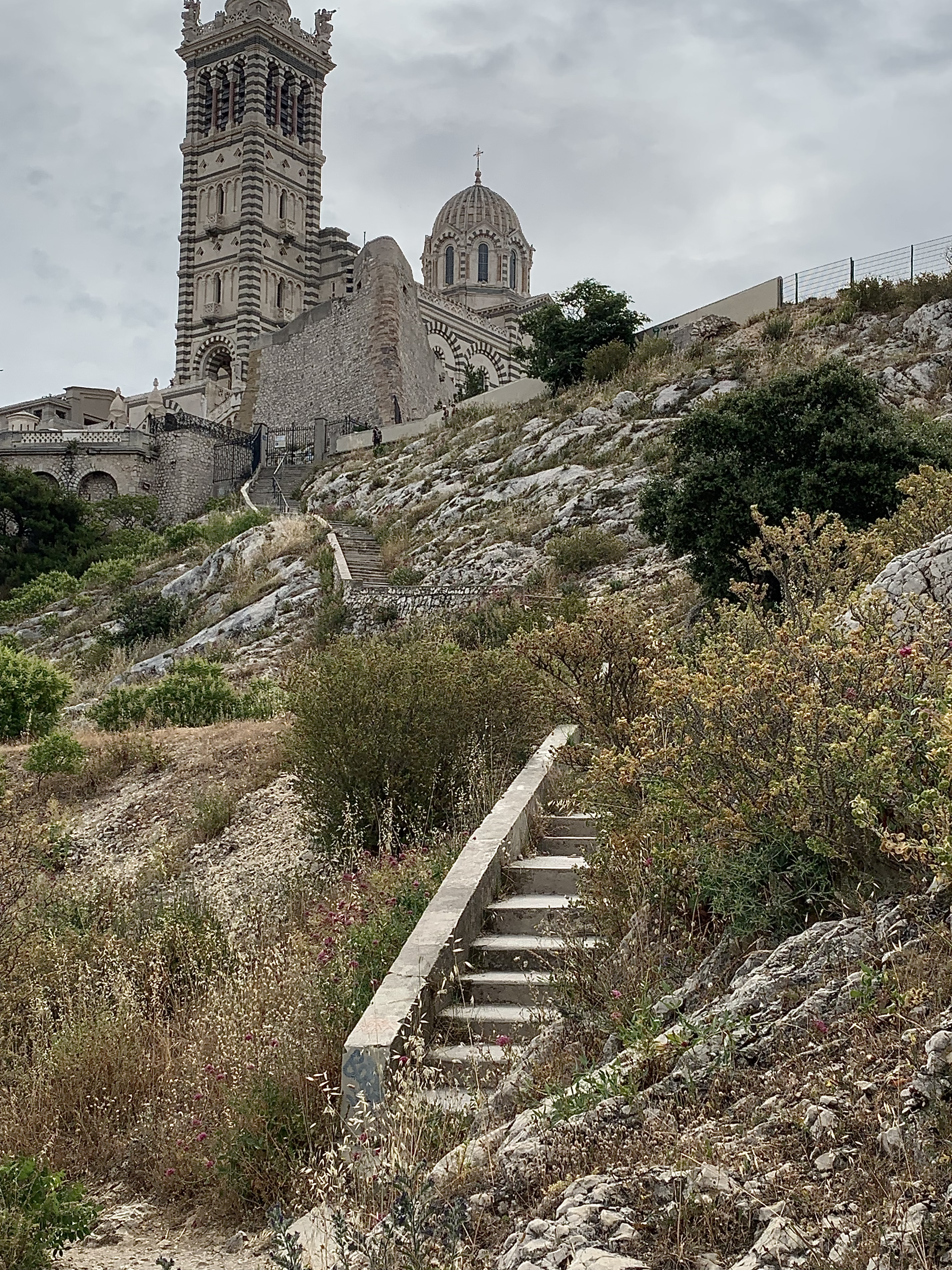 Ainsi, en partant de la plage du Roucas Blanc, je le suivais afin prendre de l’altitude et atteindre Notre-Dame de la Garde (NDG) par ce sentier ponctué de nombreux escaliers qui serpentent ici dans le 6 et 7e arrondissements. L’heure n’est pas à la performance, il fait bon à Marseille s’arrêter sur une place abritée pour prendre un café et flâner dans les ruelles, s’y perdre parfois puis retrouver ses marques. L’ascension vers l’église emblématique est ainsi lente.
