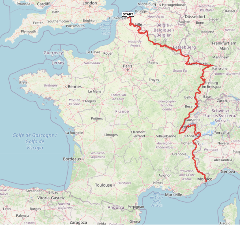 Lorsque l’idée de rallier la mer du nord à la mer Méditerranée, en passant par les montagnes, m’est apparue, je n’avais pas de chemin prédéfini ; c’est là toute la force de mon projet. C’est au travers de discussions, de rencontres et de découvertes que je fais évoluer le tracé de mon trajet. Partant de Dunkerque, je longe les frontières belge, luxembourgeoise et allemande pour descendre à travers les Vosges, le Jura et les Alpes jusqu’à Menton. J’arpenterai quelques chemins connus tel que le GR16, le GR5 (et ses variantes) et surtout de nombreux kilomètres non balisés, mais tout aussi chouettes.