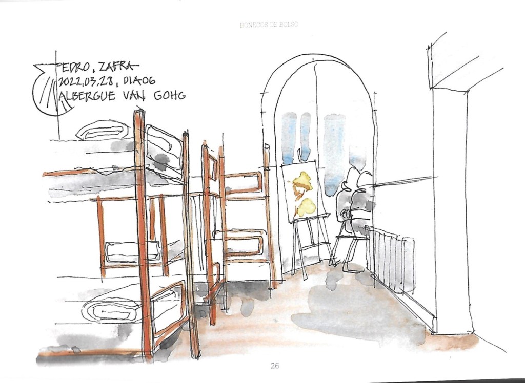 Voilà donc quelques extraits de son carnet de voyage sur la Via de la Plata. Chacune de ces illustrations m’est familière et me ramène avec délice sur ce long périple à travers l’Espagne. Alors j’ai voulu à mon tour partager avec vous ces émotions si joliment peintes par Pédro et vous inciter à tenter l’expérience de cette grande solitude où chaque ville traversée est comme une oasis de beauté, de culture, où chaque rencontre comme celle-ci donnera du sens à votre chemin.