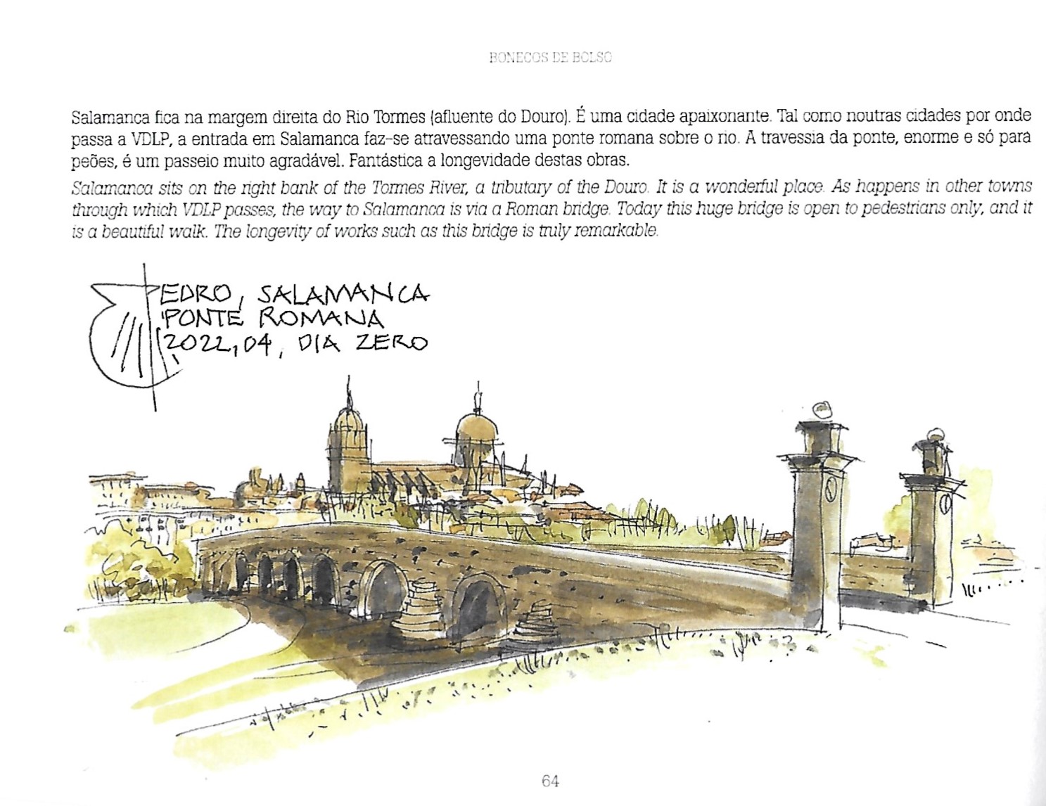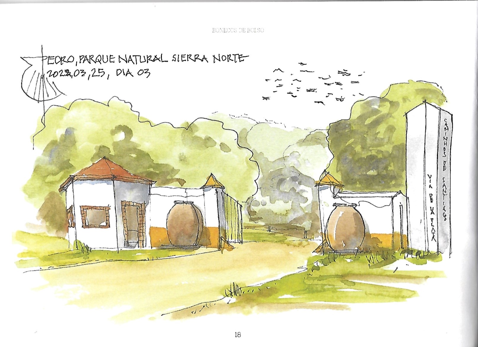 Voilà donc quelques extraits de son carnet de voyage sur la Via de la Plata. Chacune de ces illustrations m’est familière et me ramène avec délice sur ce long périple à travers l’Espagne. Alors j’ai voulu à mon tour partager avec vous ces émotions si joliment peintes par Pédro et vous inciter à tenter l’expérience de cette grande solitude où chaque ville traversée est comme une oasis de beauté, de culture, où chaque rencontre comme celle-ci donnera du sens à votre chemin.