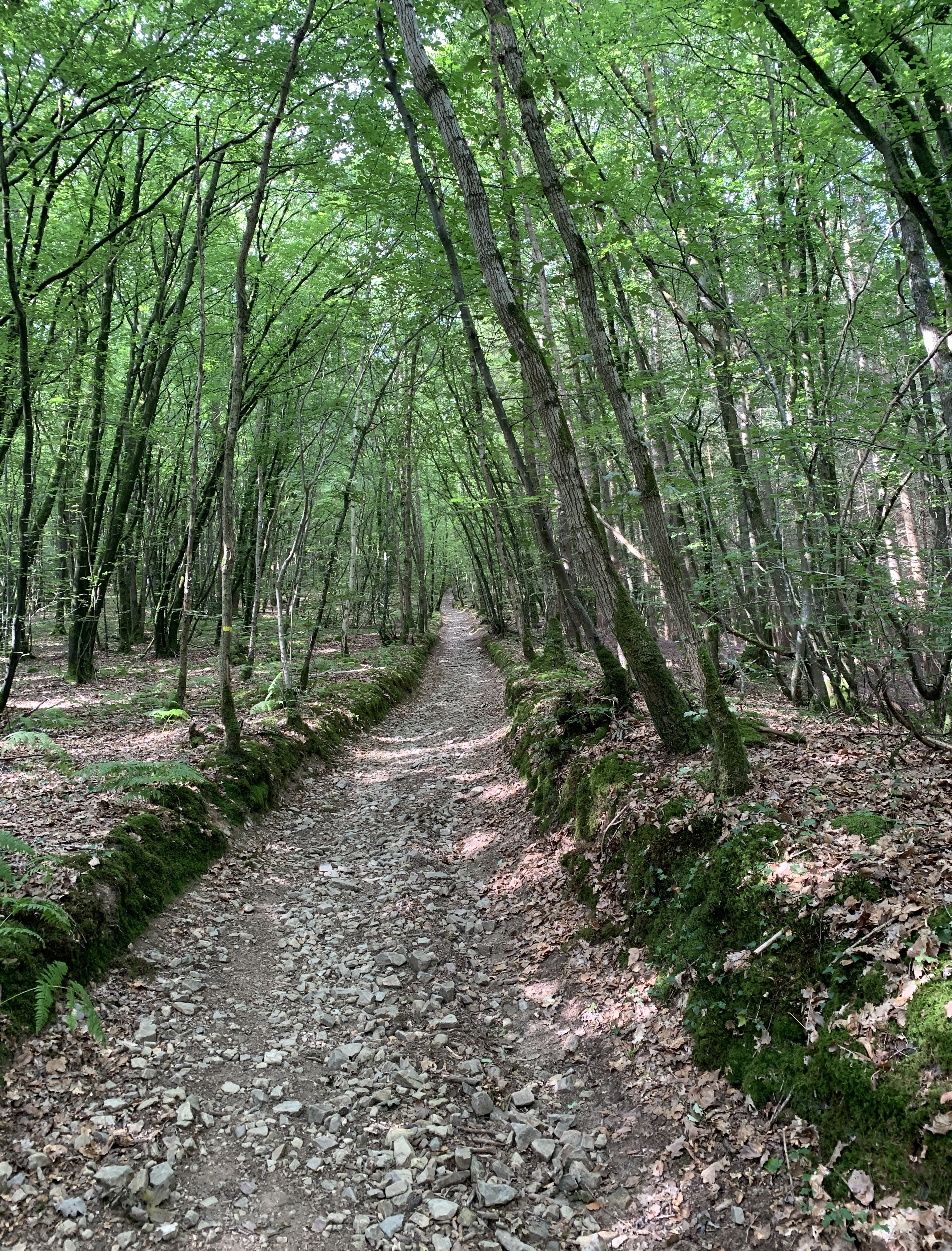 De collines en fonds de vallées à répétition, cet itinéraire se révèle un rien usant , même sur des étapes de 19 à 24 km. Bien des randonneurs habitués aux alpages reconnaissent cette difficulté comme me l’ont confirmé des hébergeurs. Côté nature du sol rencontrée, il s’agit de sentiers de terre habituels, souvent pierreux ou de chemins agricoles très bien entretenus. J’ai rencontré à plusieurs reprises des équipes municipales en train de débroussailler, élaguer, ratisser . Le parcours est souvent très abrité, blotti dans des tunnels de verdure formés par des haies, barrières au vent courantes dans le bocage normand. Malgré tout, on y emprunte régulièrement d’inévitables portions de route bitumée. Mieux vaut avoir les embouts de ses bâtons de marche à portée de main pour progresser sur ces divers terrains.