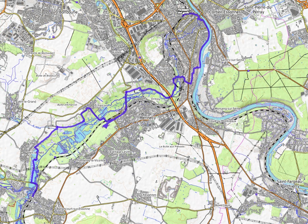 Le bassin versant de la Seine est propice à de nombreuses découvertes en randonnée. Il suffit de quitter les rives du fleuve à la gare de Corbeil puis longer l’Essonne et la Jouine pour s’immerger dans un décor où se mêlent l’eau et la forêt. Ce parcours de 22 km sans difficultés passe par le GR11 C et fut l’occasion de pénétrer dans le superbe parc de Villeroy et s’arrêter un instant pour écouter une conférencière passionnée de ce territoire. Elle nous conta la fabuleuse histoire de Nicolas de Neuville , celle d’un château qui fut rasé pour céder le passage à une voie qui ne vit jamais le jour, et bien d’autres anecdotes savoureuses . L’itinéraire traverse désormais une zone bien plus urbanisée que naguère mais les marais conservent encore toute leur magie au cœur de l’hiver. Le retour vers Paris se fait par la gare de Ballancourt (RER D, changement Viry-Chatillon)
