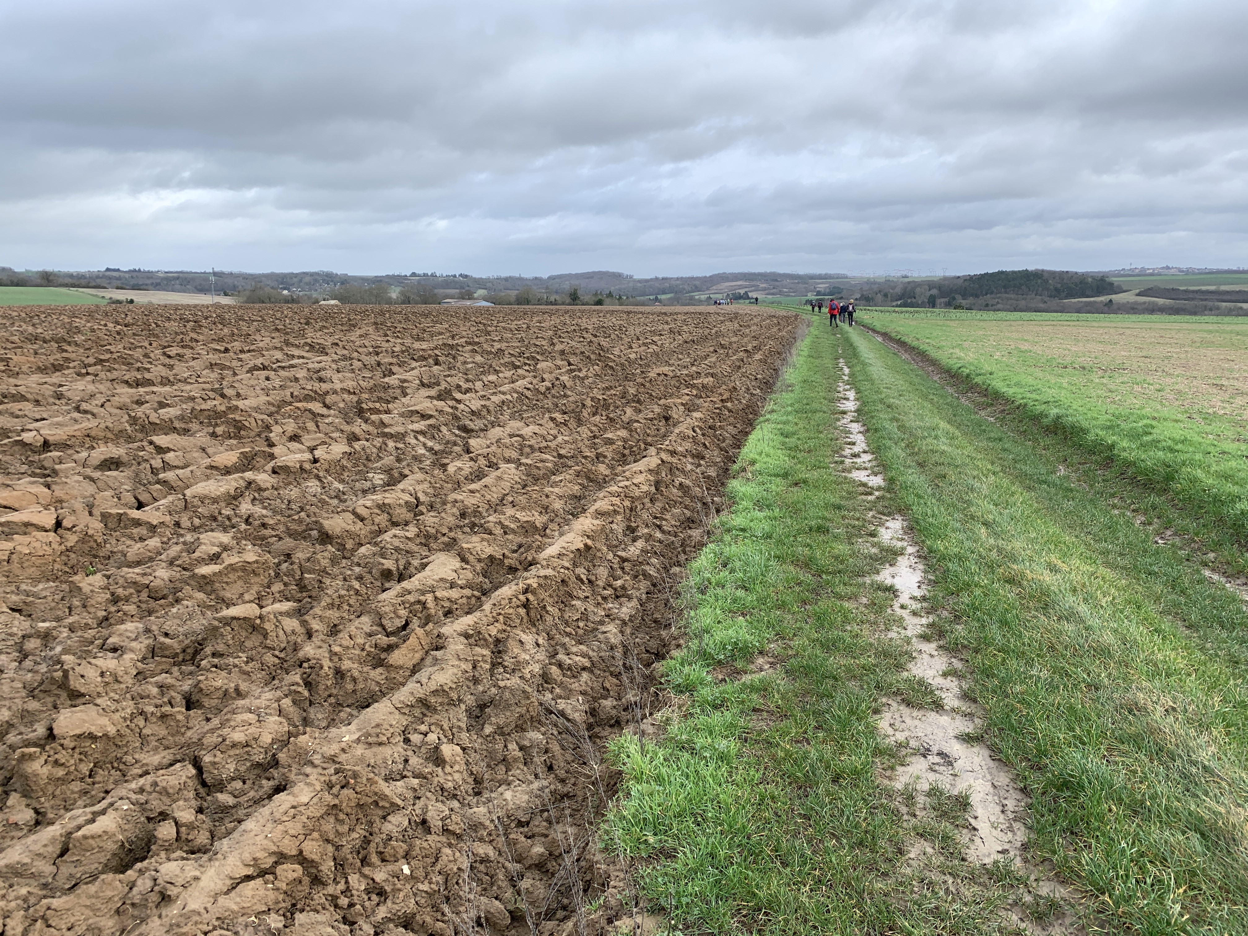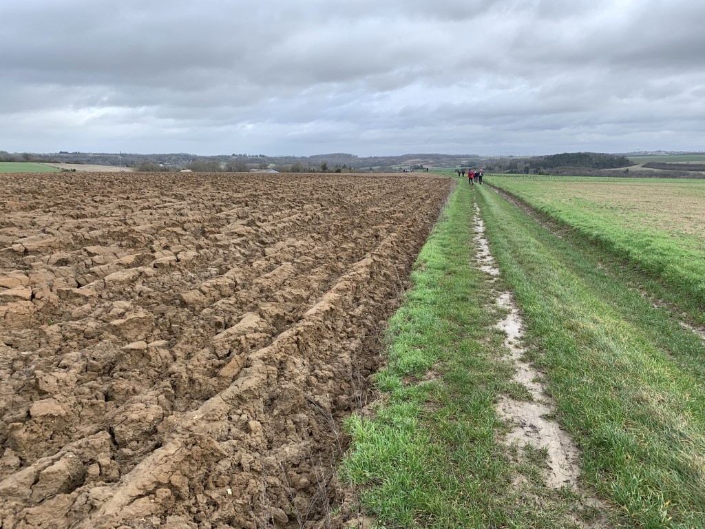 Comme une ondulation qui parcourt la carte, cette randonnée flirte avec le Vexin, hésite à pénétrer dans le Parc Naturel Régional de 65.000 ha. Et pourtant les immenses plaines au repos nous replongent dans cet univers où les labours laissent respirer cette terre généreuse d’où naitront demain le blé, l’orge, le maïs et la betterave. Pour l’heure, les dépressions balaient l’Hexagone et pourvoient des nuages menaçants d’où s’échappent tout au long de cette journée des rideaux de pluie éphémères. Alors le décor s’imbibe, ruisselle, la nature se gorge et se nourrit de cette bruine précieuse.