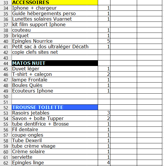 Ci-dessus la check list complète que je pointe lors du chargement du sac avant le départ.