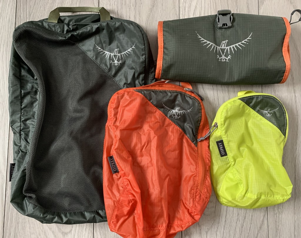 Rangements 3 Pochettes Osprey : 1) Une grande pour les vêtements avec deux compartiments 2) une moyenne pour la nuit (T-shirt, boxer coton, boules Quiès, écouteurs Iphones, masque.) 3) une petite pour le matériel divers (chargeur, etc.. Trousse de toilette roulable Osprey . Ces 3 pochettes sont moins bruyantes en dortoir que les sacs congélation, mais moins étanches. En cas de grosse pluie je les place dans des sacs plastique.