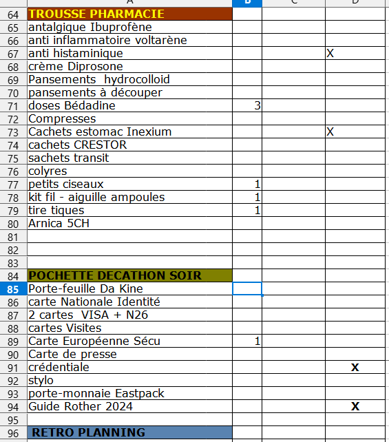 Ci-dessus la check list complète que je pointe lors du chargement du sac avant le départ.