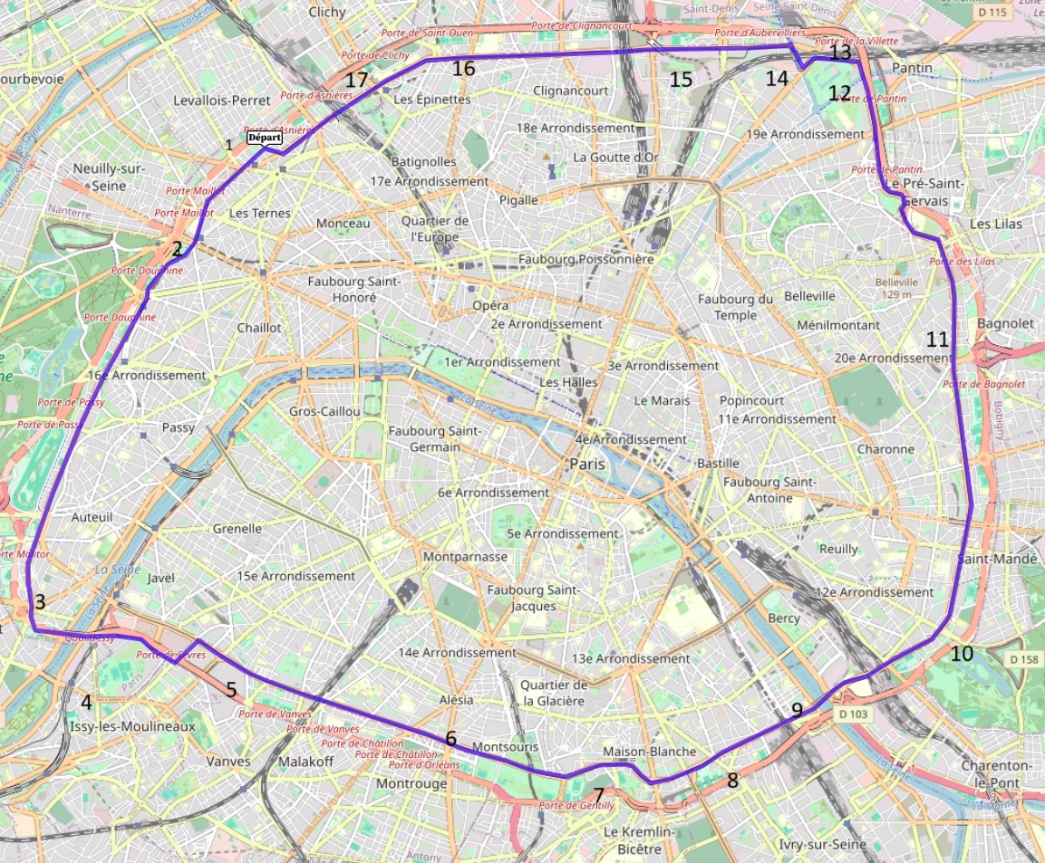 Il est désormais possible de réaliser le grand tour de Paris à vélo en toute sécurité par les boulevards des Maréchaux qui sont équipés pistes cyclables parfaitement repérées. Merci madame Pécresse ! J’ai effectué cette boucle en VAE (Vélo Assistance Electrique) – Cette expérience m’a permis de tester ces voies , les caractéristiques du parcours ainsi que l’autonomie de mon vélo (O2 Feel – 350w) . Cette boucle de 34 km a été réalisée en 3h30 avec plusieurs pauses (Café- Porte de Versailles, plein d’eau Porte Dorée, pique-nique Porte de la Chapelle ) – le dénivelé : + 171 m – Détail complet de la progression depuis la Porte Champerret (sens anti horaire)
