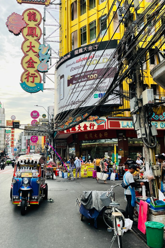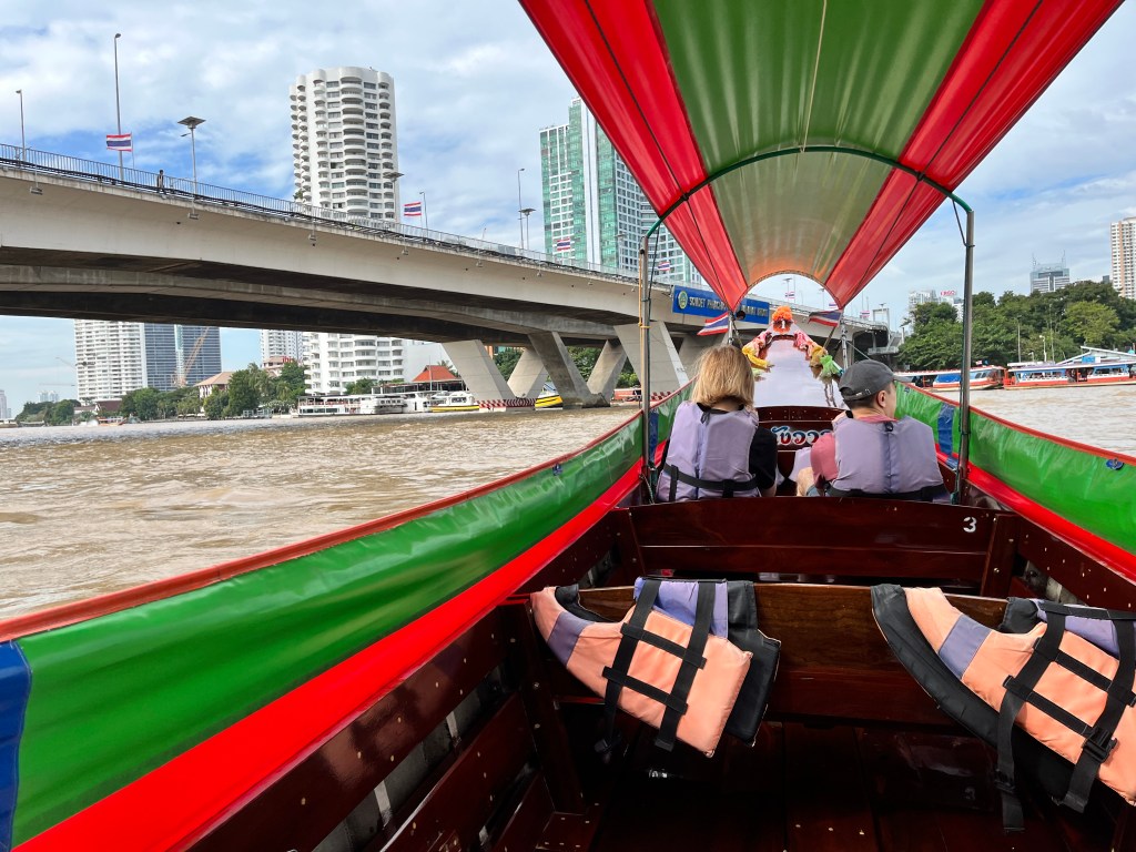 C’est une bonne occasion de découvrir un autre visage de Bangkok, plus paisible. Après une heure de navigation bercée par le moteur de camion ronronnant à ciel ouvert , tenu à bout de bras par un pilote costaud, retour sur le fleuve. Les long tails des touristes défient ici les convois de barges tirées par des remorqueurs, un balai bien orchestré. J’ai choisi de rentrer à mon hôtel en utilisant le bateau-bus qui dessert tout le quartier de la vieille ville pour éviter la circulation du centre-ville pendant la période de pointe. Je termine cette première balade dans la capitale en allant dîner (à pied !) au Night Bazaar, situé au sud-est de la ville. Camelots, street food, boutiques à souvenirs, empire du toc, débauche de néons, un vrai bonheur.
