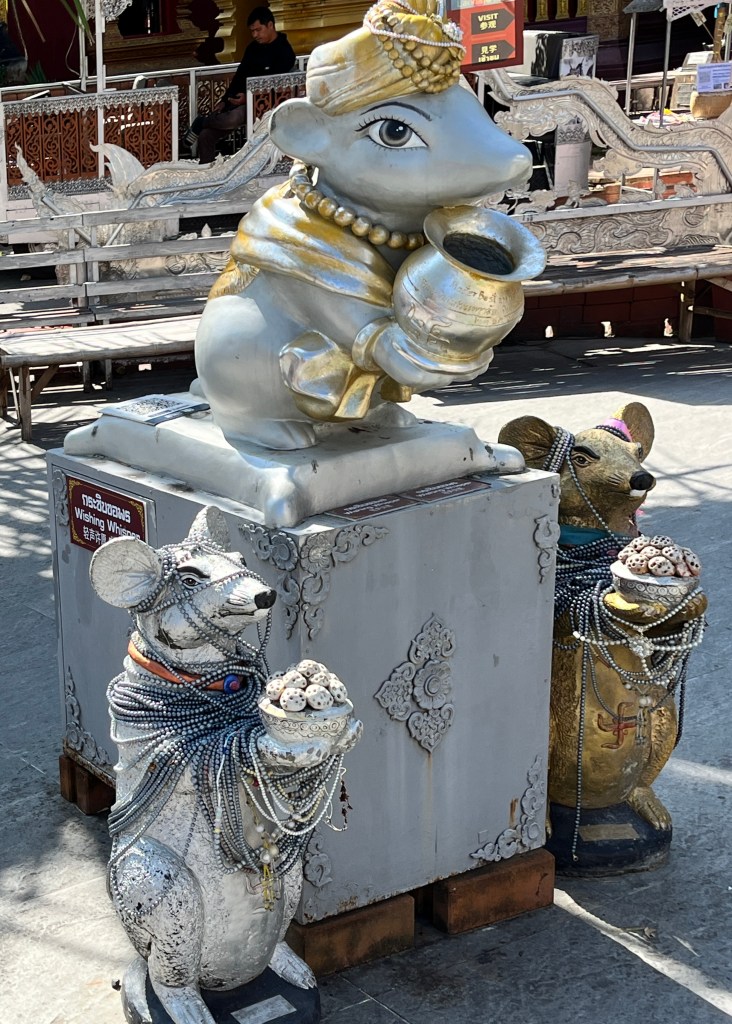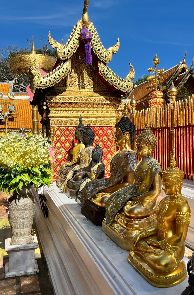 La cité grouille d’expositions d’art contemporain, de galeries et bien sûr de restos, d’agences de voyages et bien sûr de salons de massage. C’est ici que vous partirez en trek dans le fameux Triangle d’or, ses montagnes, ses minorités ethniques, peut même à la rencontre des éléphants et du Mékong. Pour ma part, un autre programme. La montée au mont Suthep et la visite du temple au sommet restent un must. Je décide de m’y rendre tôt et me rends à la station des taxis collectifs (rouges) à côté du marché. Les chauffeurs y prennent leur petit déj en attendant qu’au moins six clients se présentent. Rien ne presse vraiment, mais après d’une demi-heure, nous sommes seulement trois : une Argentine, une Japonaise et moi. Lassés d’attendre , nous prendrons finalement un Grabe en commun. Les cyclistes sportifs se frottent à une interminable montée pour atteindre 1676 m d’altitude et admirer , avec un peu de chance, le lever de soleil sur la ville.