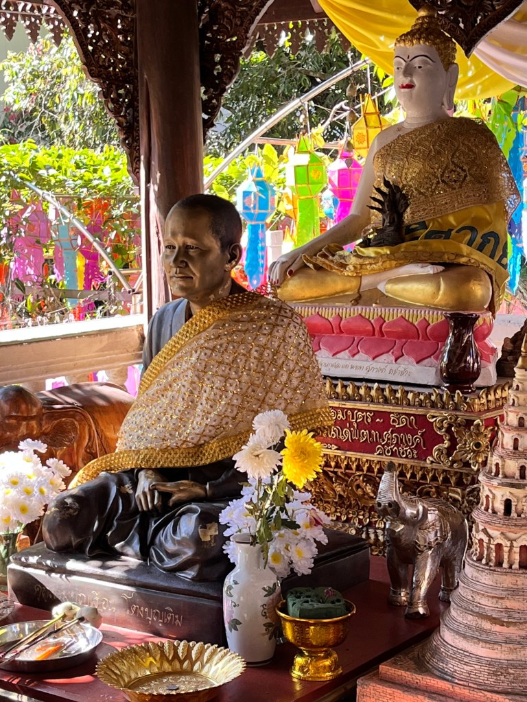 Arrivé à destination, il est possible de prendre un funiculaire jusqu’au temple ou se coltiner les 309 marches. L’enceinte du temple très ombragée est ventilée par un vent doux. En bon pèlerin de Compostelle, j’emboîte le pas de quelques fidèles qui font trois fois le tour du grand chédi doré en récitant des prières une fleur jaune à la main ! Des moines bouddhistes peuvent vous y bénir moyennant rétribution. La descente passe par une foultitude de magasins de souvenirs et se serait un péché mortel de ne pas y marchander un stock de porte-bonheur pour la famille et les amis. (Ravissant petit cœur accroché à une clochette!)