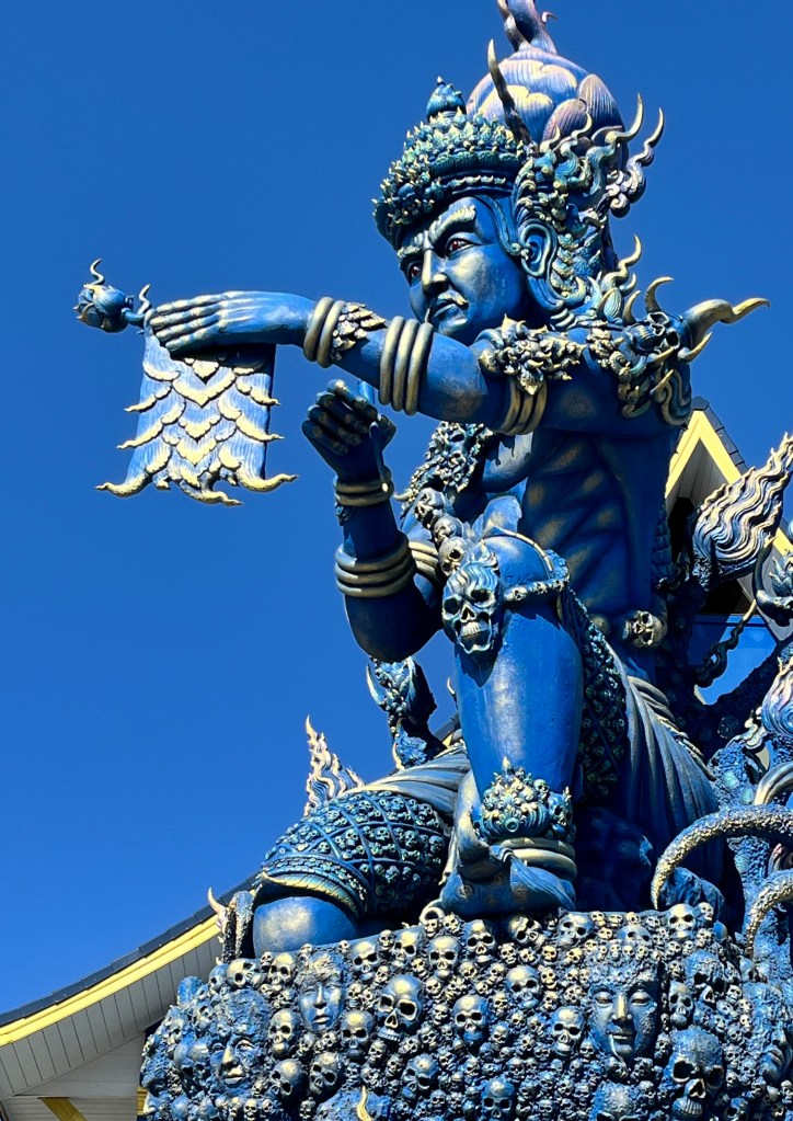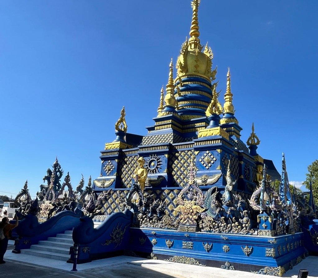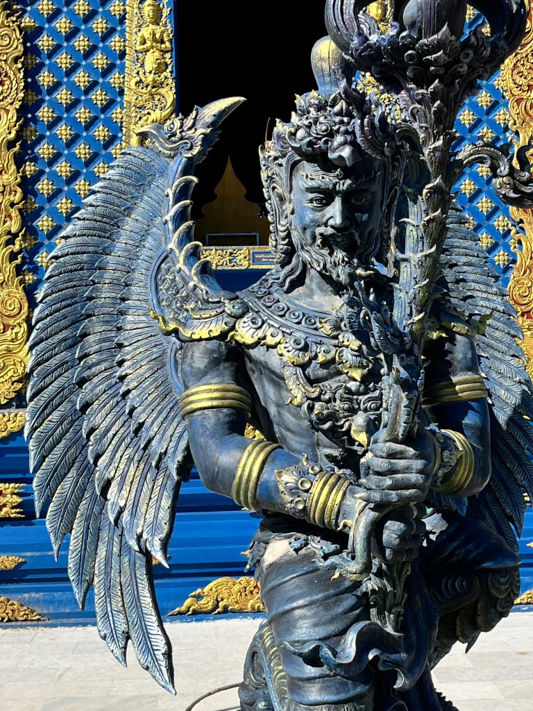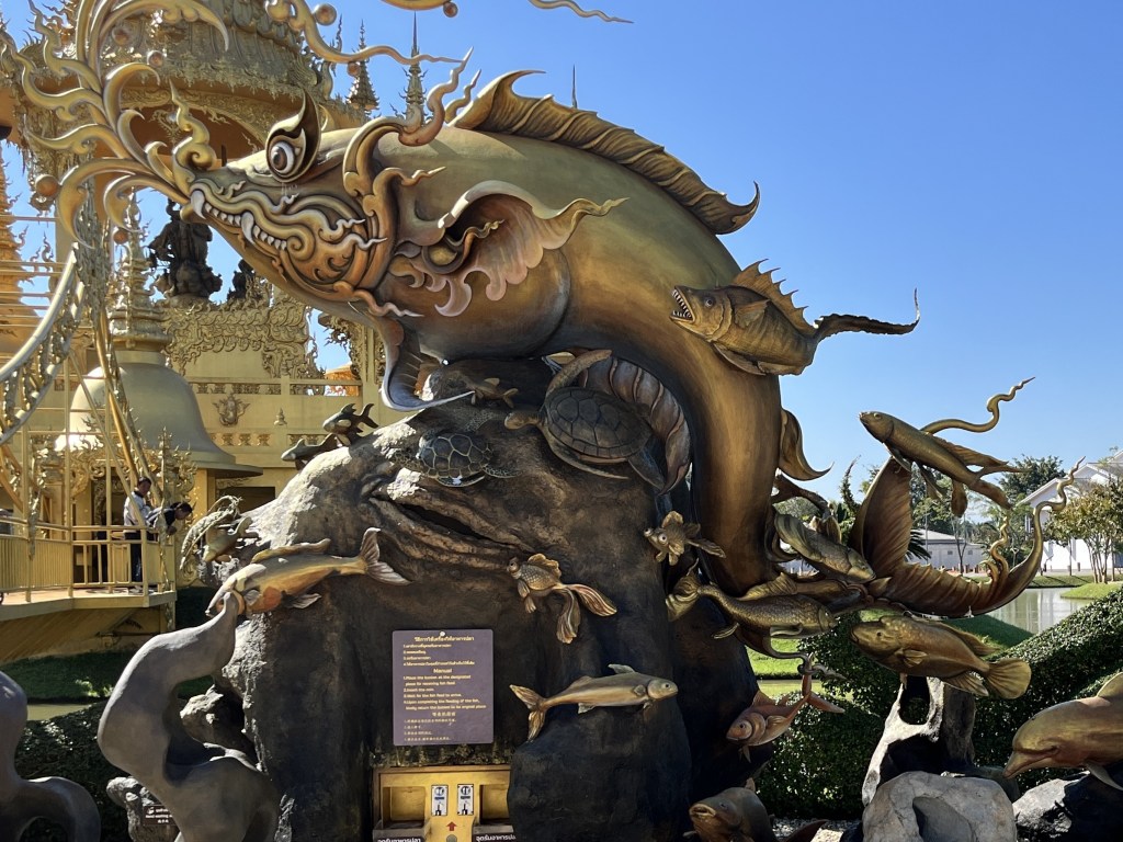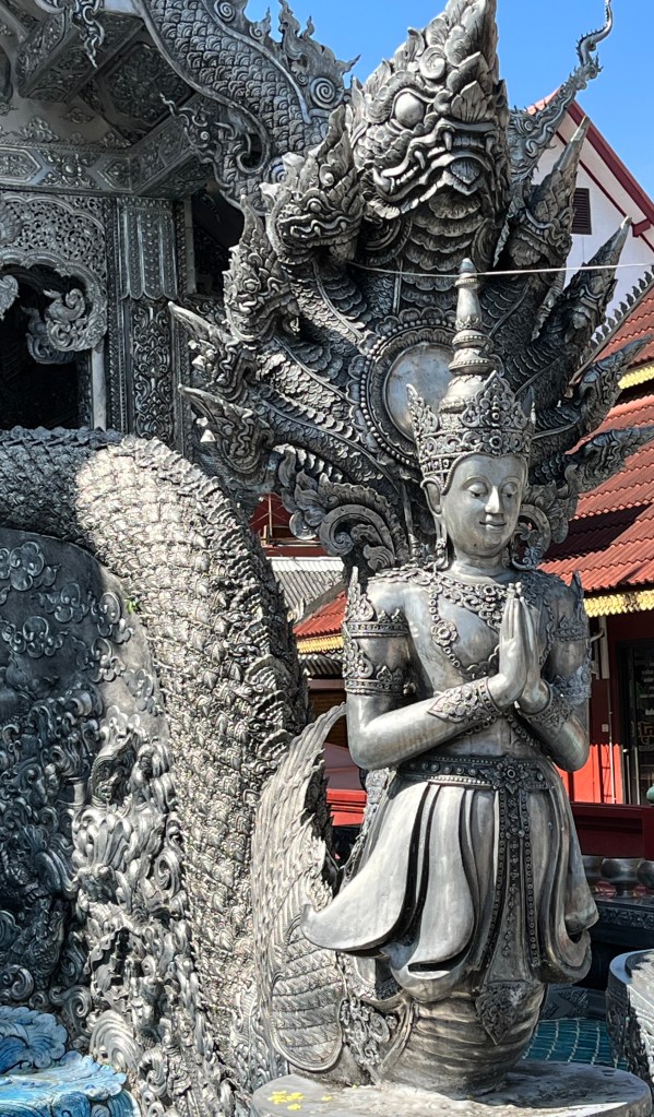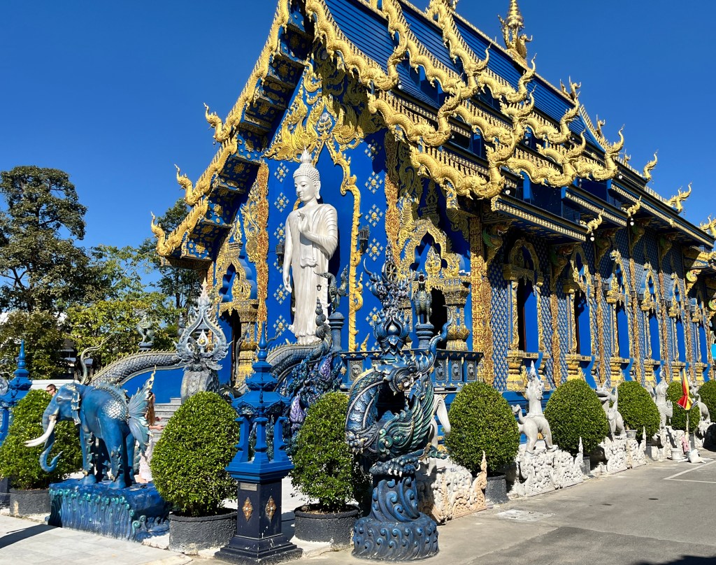 C’est époustouflant. A ne pas manquer aussi lors de la balade en ville, la Clock Tower cette fois dorée à souhait et bien sûr, le Blue Temple, un autre édifice un fou gardé par ses deux nâgas géants au regard inquiétant. En fin d’après-midi la gare routière s’anime. J’achète mon billet de bus pour Chiang Mail distante de 350 km et passe la soirée au night market local en dégustant une soupe face à la scène où sévissent quelques chanteurs et danseuses dans une relative indifférence.