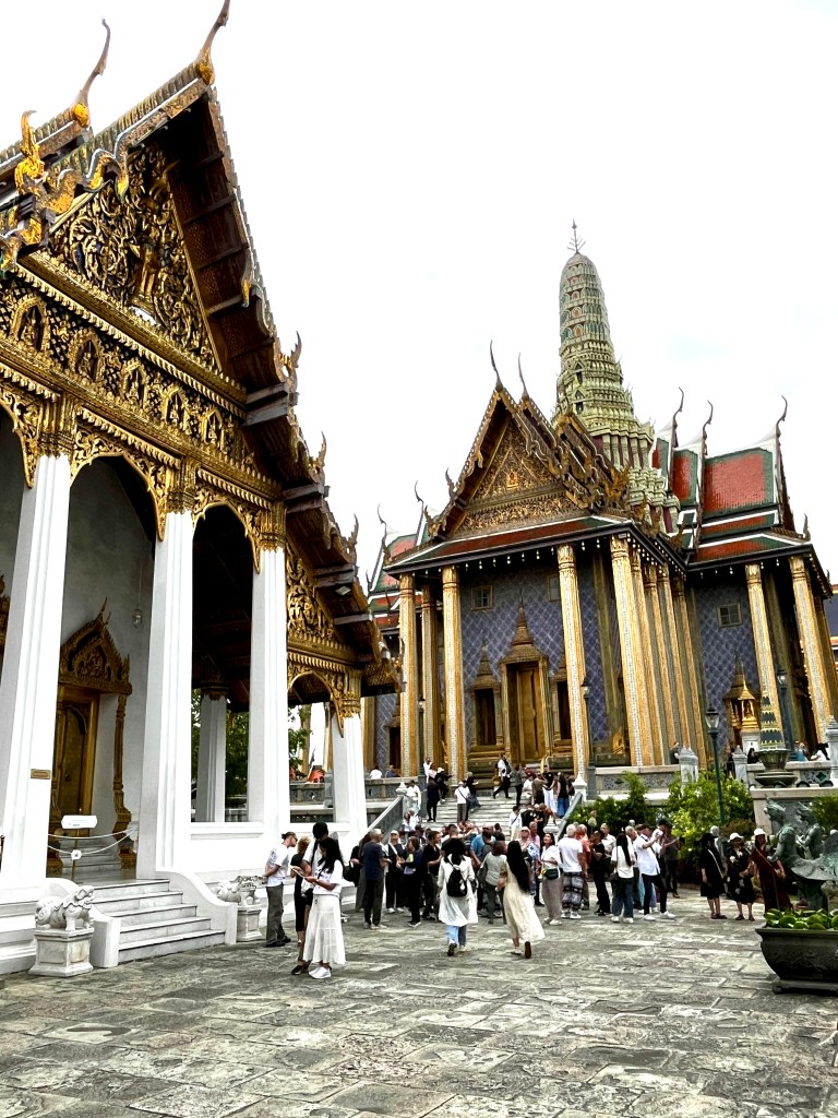 Que de souvenirs.. ! Mon dernier voyage à Bangkok remonte à 2008, j’étais alors en reportage et l’Office du Tourisme avait attribué aux journalistes un guide privé sur le thème de son choix. Royal ! Des images savoureuses ressurgissent et c’est avec plaisir que je redécouvre ces symboles du royaume. Malgré mon arrivée précoce vers 8 h 30 , je me heurte déjà à la vague des visiteurs. Les militaires et une armée de volontaires de la Croix-Rouge locale gèrent parfaitement ce flux. En touriste distrait, je suis venu en short malgré l’avertissement du Routard, ce qui me vaut l’achat d’un pantalon thaï obligatoire, moche, taille XXL. Ce Royal Palace se présente comme un grand délire architectural sur plusieurs hectares , étincelant de tout son or.