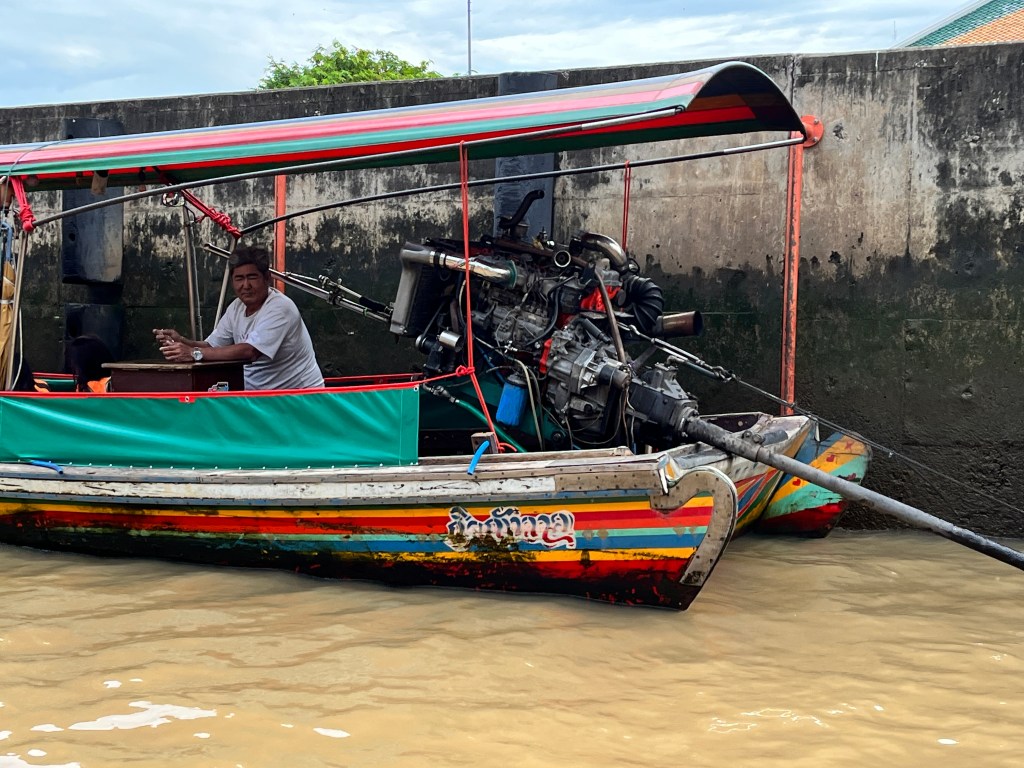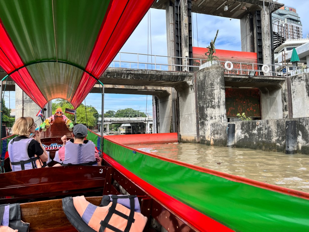 Bangkok est immense, épuisante, j’ai parcouru tout de même une douzaine de kilomètres chaque jour ! Je renonce toutefois à me rendre à pied à l’embarcadère très éloigné desservant les khlong, ces canaux qui sillonnent la Cité des Anges  sur la rive droite du fleuve. La moto Grabe me dépose sur le site calé sous un pont, je négocie un tarif solo et embarque sur un long tail avec un jeune couple de Hollandais suréquipés en matos photo. La balade débute par une courte traversée jusqu’à l’écluse d’entrée du canal, plus bas que le fleuve.
