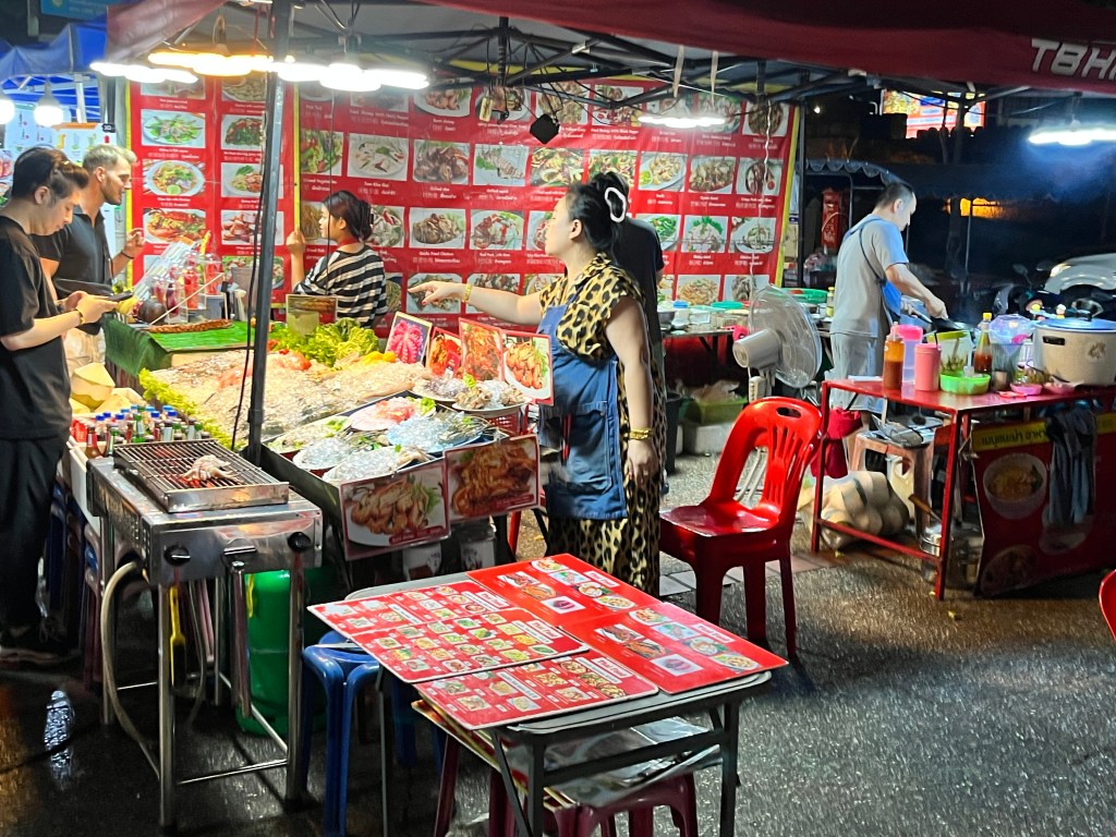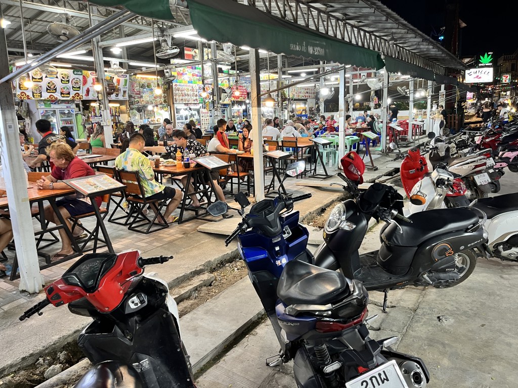 Ces visites m’ont ouvert l’appétit, direction les nombreux petits restos du quartier. Tous disposent d’un classeur où les plats sont présentés en photo sous des pochettes cristal, parfois en plusieurs langues. Je découvre les soupes épicées, des plats de pad thaï à base de riz ou de nouilles collantes (noodles), garnis de porc, de poulet , de bœuf, de calmar, de fruits de mer ou de divers poissons grillés. On arrose le tout à la bière locale Chang, Singha ou Léo. Je n’y ai pas trouvé la moindre différence ! Les plus sobres optent pour leurs délicieuses préparations à base de mangue, fruit de la passion, etc., en jus ou en smoothies. Comme partout en Asie, inutile de fantasmer sur le dessert, quasi inexistant, à part quelques glaces, les fameux fruits et surtout le riz gluant sucré accompagné de mangue. Ça cale ! (7 à 10 € pour un repas)