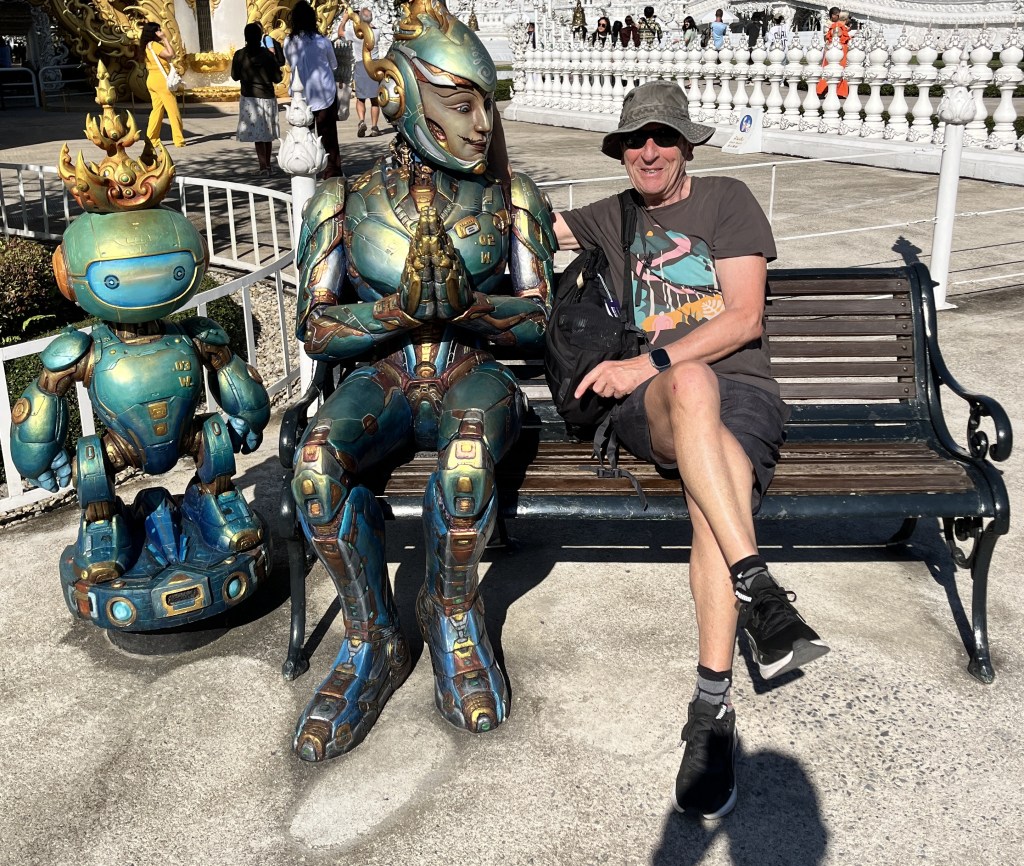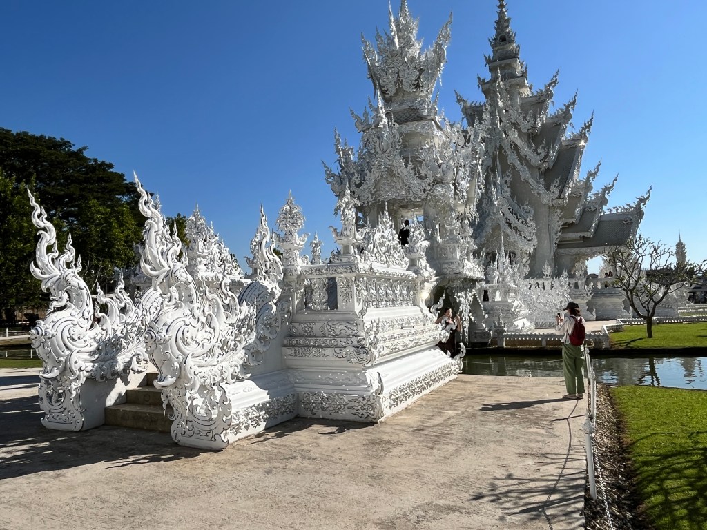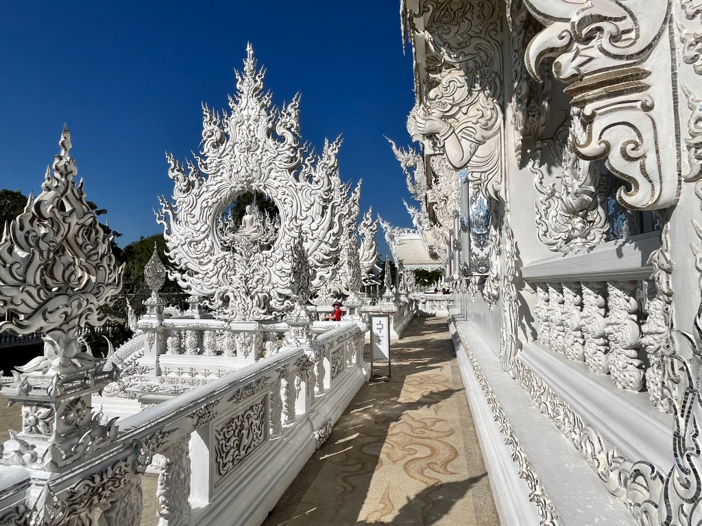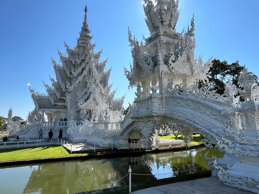 Les filles du salon de massage d’en face n’en finissent pas de proposer leurs services (pas de méprise !). Je craque 250 baths pour un massage de pieds. La véritable attraction de Chiang Rai se trouve à quelques kilomètres. Je prends ainsi un bus pour aller visiter le White Temple , un édifice hors normes dans ce pays. Imaginez un ensemble immaculé , genre meringue géante sculptée, avec une débauche de fioritures. L’architecte, un habitant de la ville très croyant, a souhaité une rupture totale avec la tradition, en adoptant le blanc, symbole de la pureté.