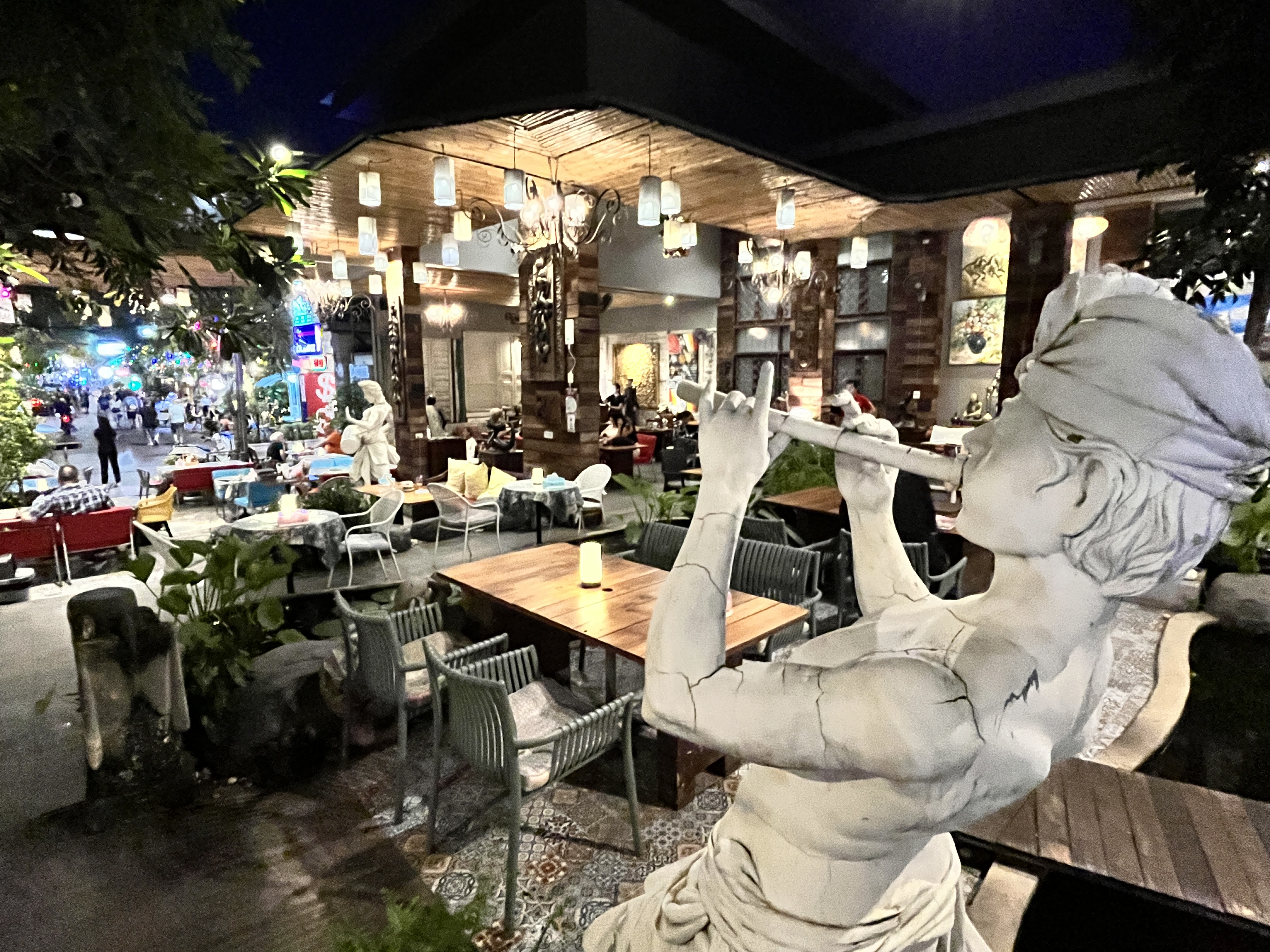 Ces visites m’ont ouvert l’appétit, direction les nombreux petits restos du quartier. Tous disposent d’un classeur où les plats sont présentés en photo sous des pochettes cristal, parfois en plusieurs langues. Je découvre les soupes épicées, des plats de pad thaï à base de riz ou de nouilles collantes (noodles), garnis de porc, de poulet , de bœuf, de calmar, de fruits de mer ou de divers poissons grillés. On arrose le tout à la bière locale Chang, Singha ou Léo. Je n’y ai pas trouvé la moindre différence ! Les plus sobres optent pour leurs délicieuses préparations à base de mangue, fruit de la passion, etc., en jus ou en smoothies. Comme partout en Asie, inutile de fantasmer sur le dessert, quasi inexistant, à part quelques glaces, les fameux fruits et surtout le riz gluant sucré accompagné de mangue. Ça cale ! (7 à 10 € pour un repas)