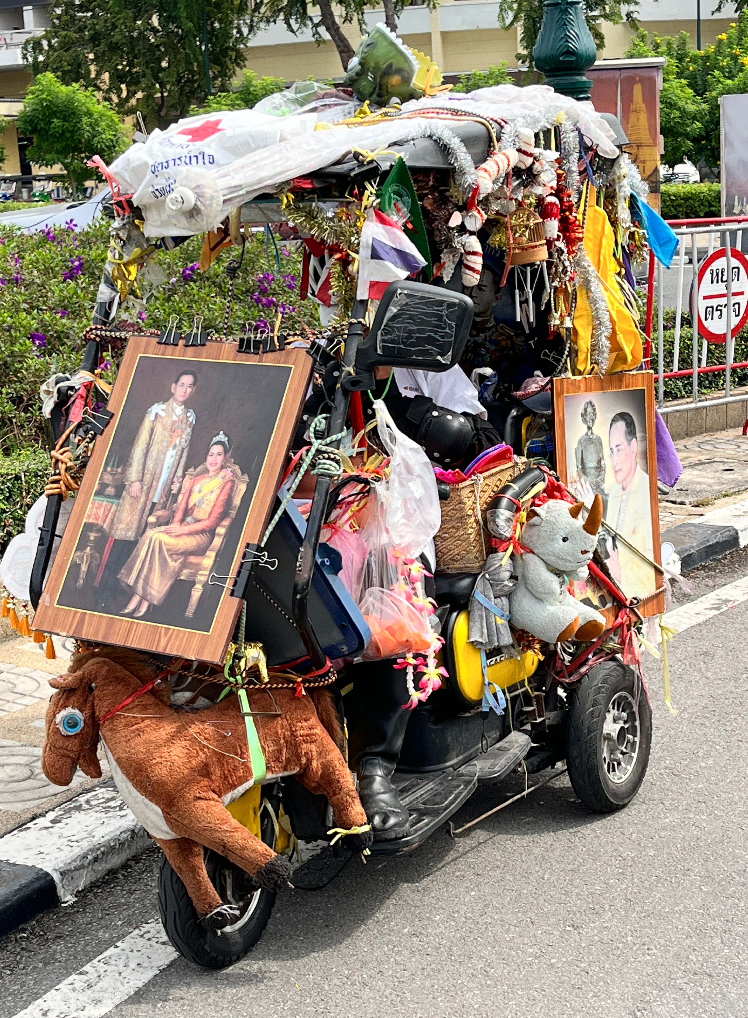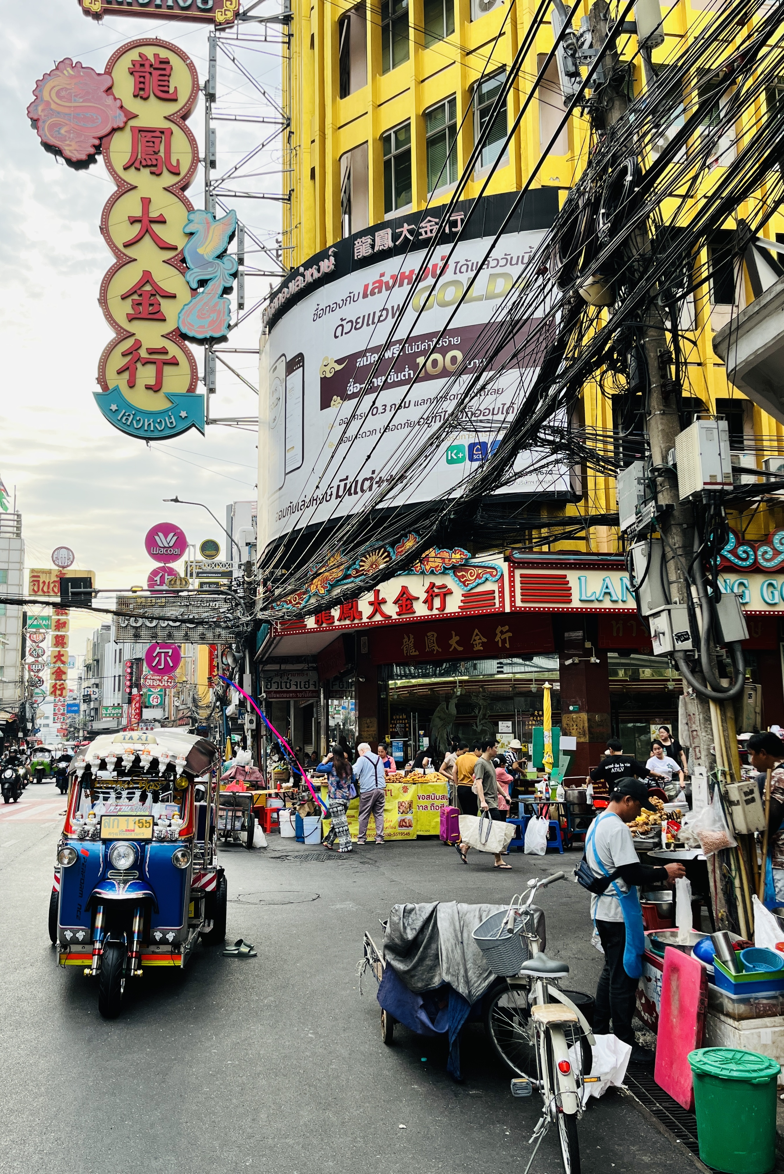 On range la doudoune, il fait 26 °C. Que le spectacle commence ! La ville est immense, parcourue de bretelles d’autoroutes qui planent sur 12 millions d’âmes. Les buildings de verre et d’acier émergent au milieu des tours d’habitations de cinquante étages et d’une mer de petits immeubles ou de maisons enchevêtrées. Les panneaux de publicité sont ici à la démesure de cette ruche. D’immenses affiches de dix mètres sur vingt vantent la cosmétique, les banques, les bagnoles et, pour l’heure, les SEA Games 2025. Les JO du Sud-Est asiatique se disputent l’espace avec les portraits de la défunte reine et du roi. Patrie, monarchie et religion, les trois piliers de la Thaïlande s’inscrivent partout ici en lettres d’or. Après une nuit réparatrice, je pars en exploration dans le vieux quartier blotti dans une anse du fleuve Chao Phraya.