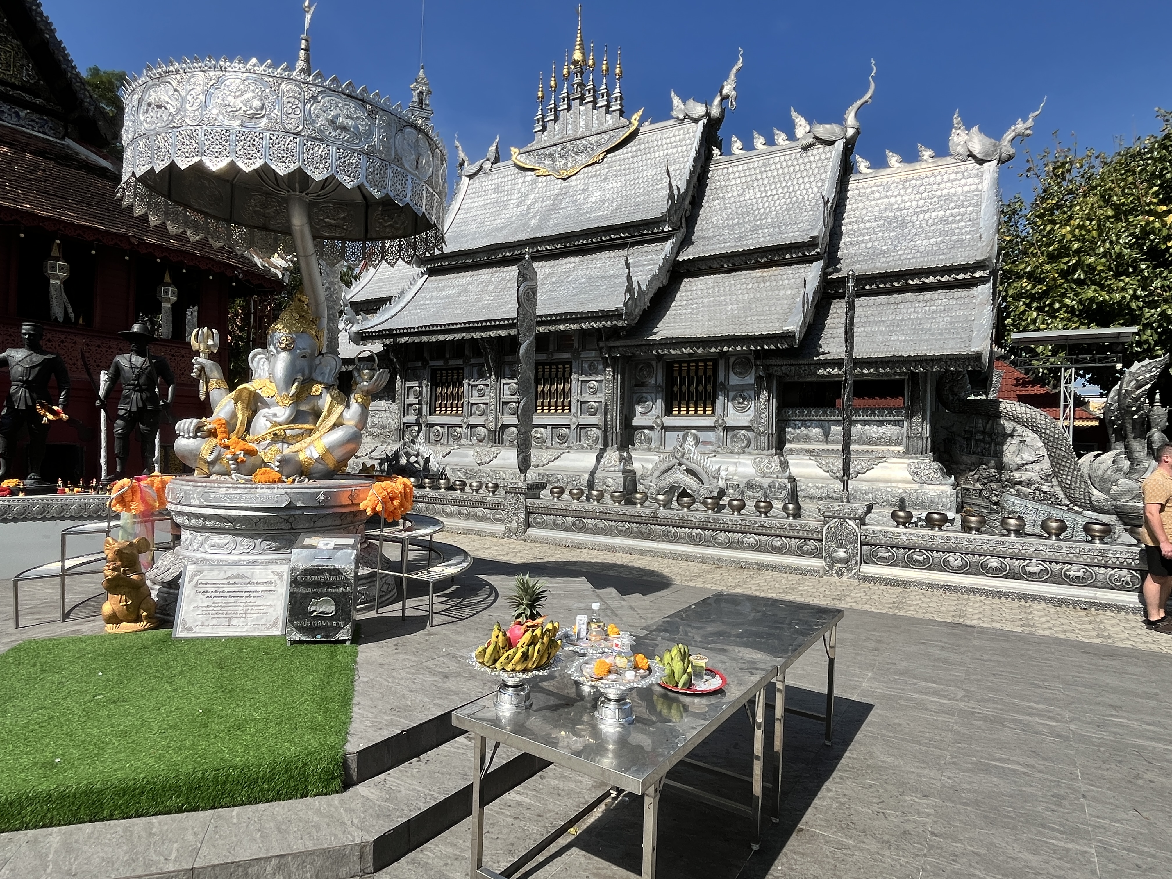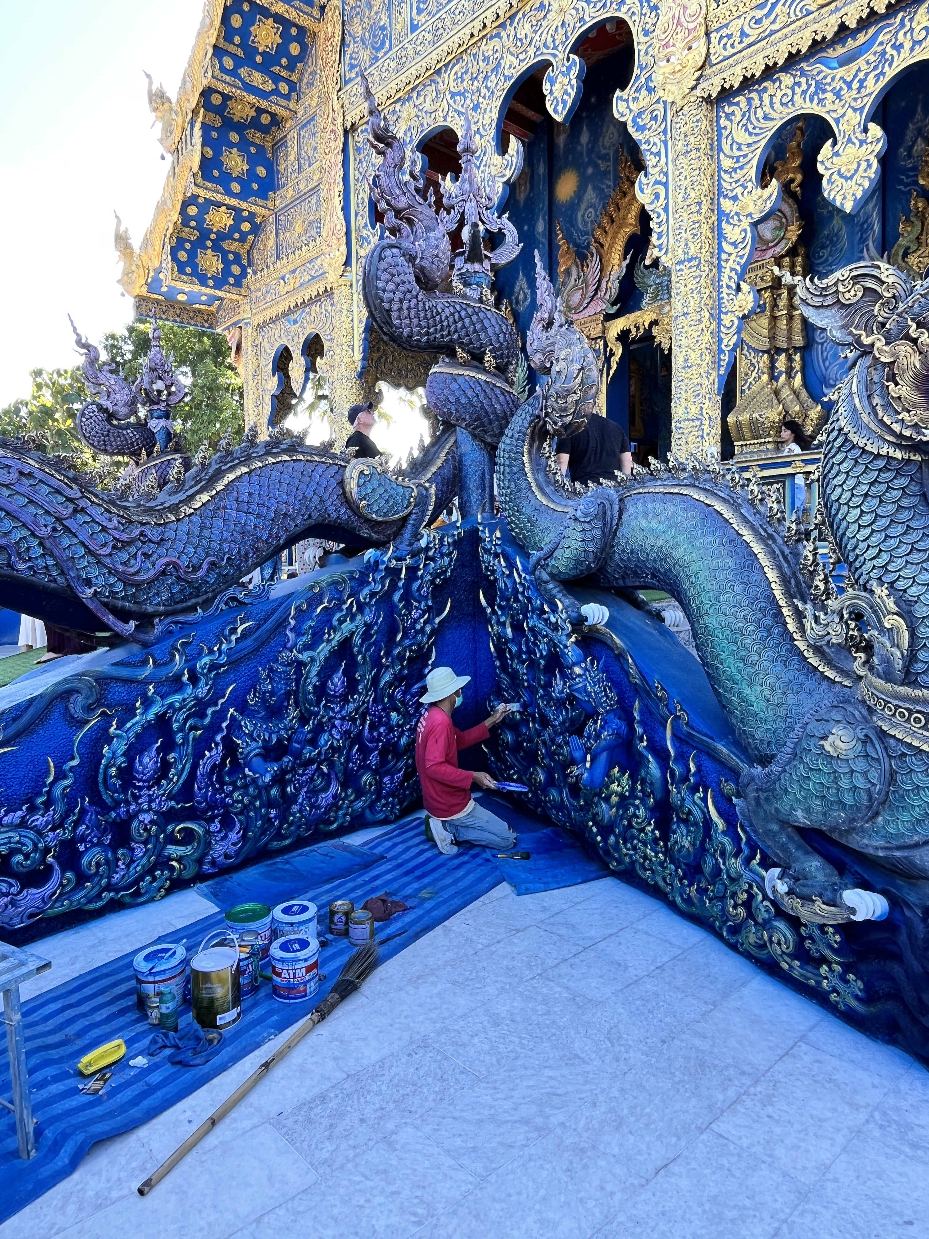 C’est époustouflant. A ne pas manquer aussi lors de la balade en ville, la Clock Tower cette fois dorée à souhait et bien sûr, le Blue Temple, un autre édifice un fou gardé par ses deux nâgas géants au regard inquiétant. En fin d’après-midi la gare routière s’anime. J’achète mon billet de bus pour Chiang Mail distante de 350 km et passe la soirée au night market local en dégustant une soupe face à la scène où sévissent quelques chanteurs et danseuses dans une relative indifférence.