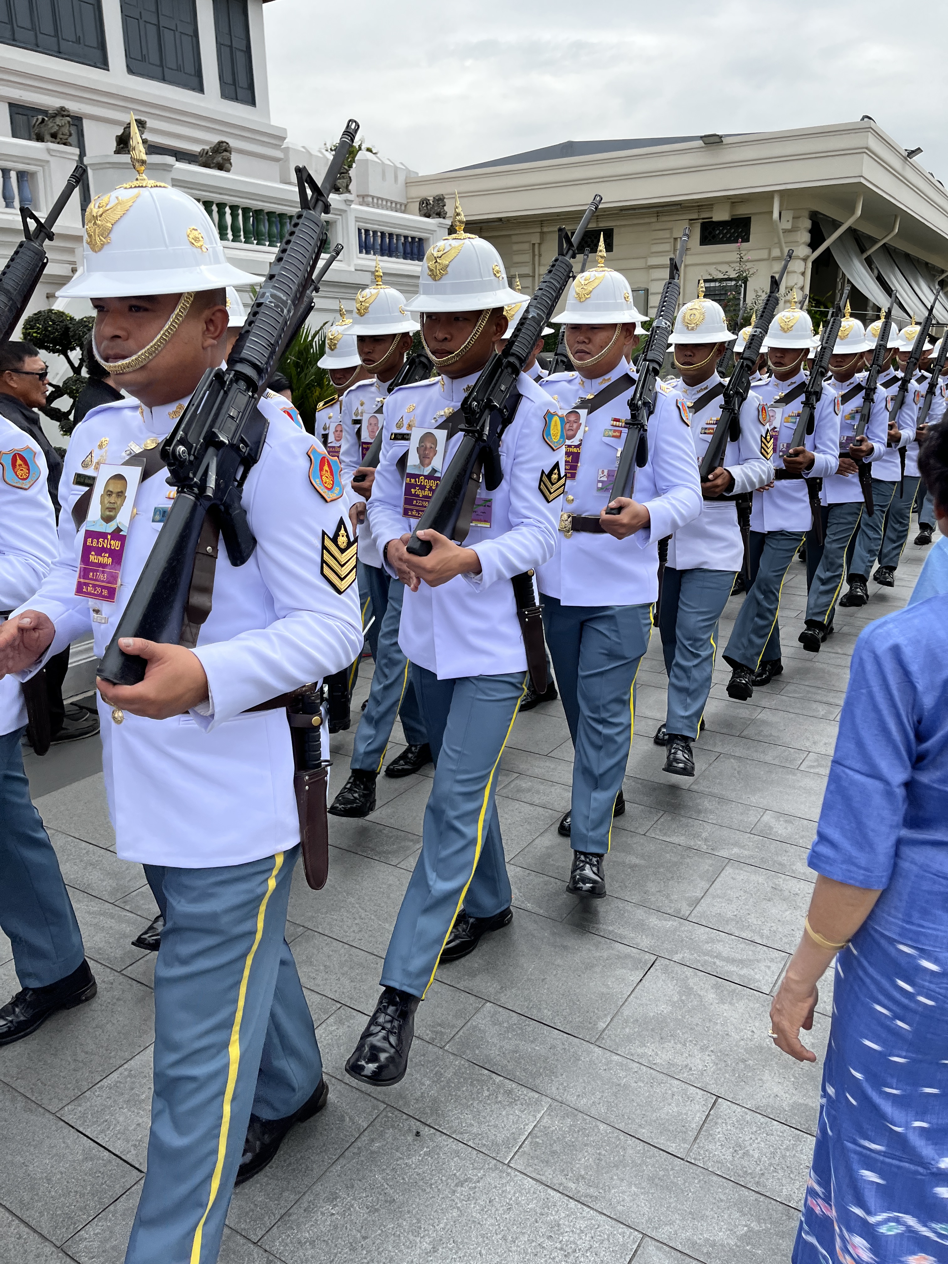 Que de souvenirs.. ! Mon dernier voyage à Bangkok remonte à 2008, j’étais alors en reportage et l’Office du Tourisme avait attribué aux journalistes un guide privé sur le thème de son choix. Royal ! Des images savoureuses ressurgissent et c’est avec plaisir que je redécouvre ces symboles du royaume. Malgré mon arrivée précoce vers 8 h 30 , je me heurte déjà à la vague des visiteurs. Les militaires et une armée de volontaires de la Croix-Rouge locale gèrent parfaitement ce flux. En touriste distrait, je suis venu en short malgré l’avertissement du Routard, ce qui me vaut l’achat d’un pantalon thaï obligatoire, moche, taille XXL. Ce Royal Palace se présente comme un grand délire architectural sur plusieurs hectares , étincelant de tout son or.